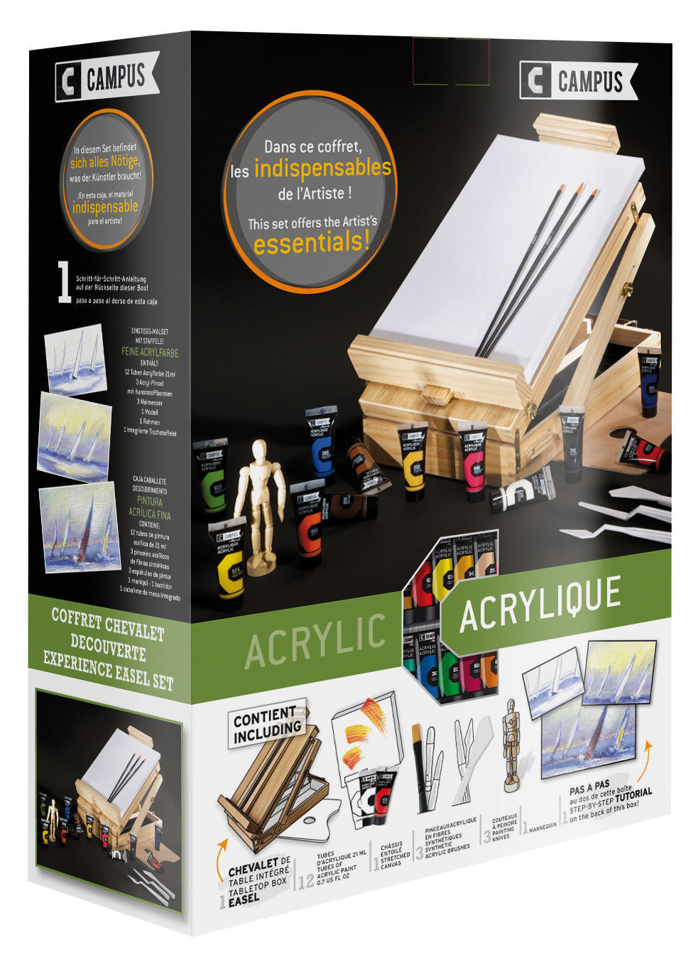 Tato sada akrylových barev v dřevěném kufříku, jež je zároveň stolním stojanem, se výborně hodí pro začátečníka. Sada totiž obsahuje naprosto vše, co je k malbě potřeba. Barvy Campus se těší velké oblibě zejména u studentů a začátečníků. Kufřík obsahuje: 12x21ml akrylové barvy Campus, dřevěný manekýn (cca 12cm), šepsované plátno 27x35cm (100% bavlna), 3 syntetické štětce,malířské špachtle, paletu Velikost kufříku: 45,5x32x13,5cm