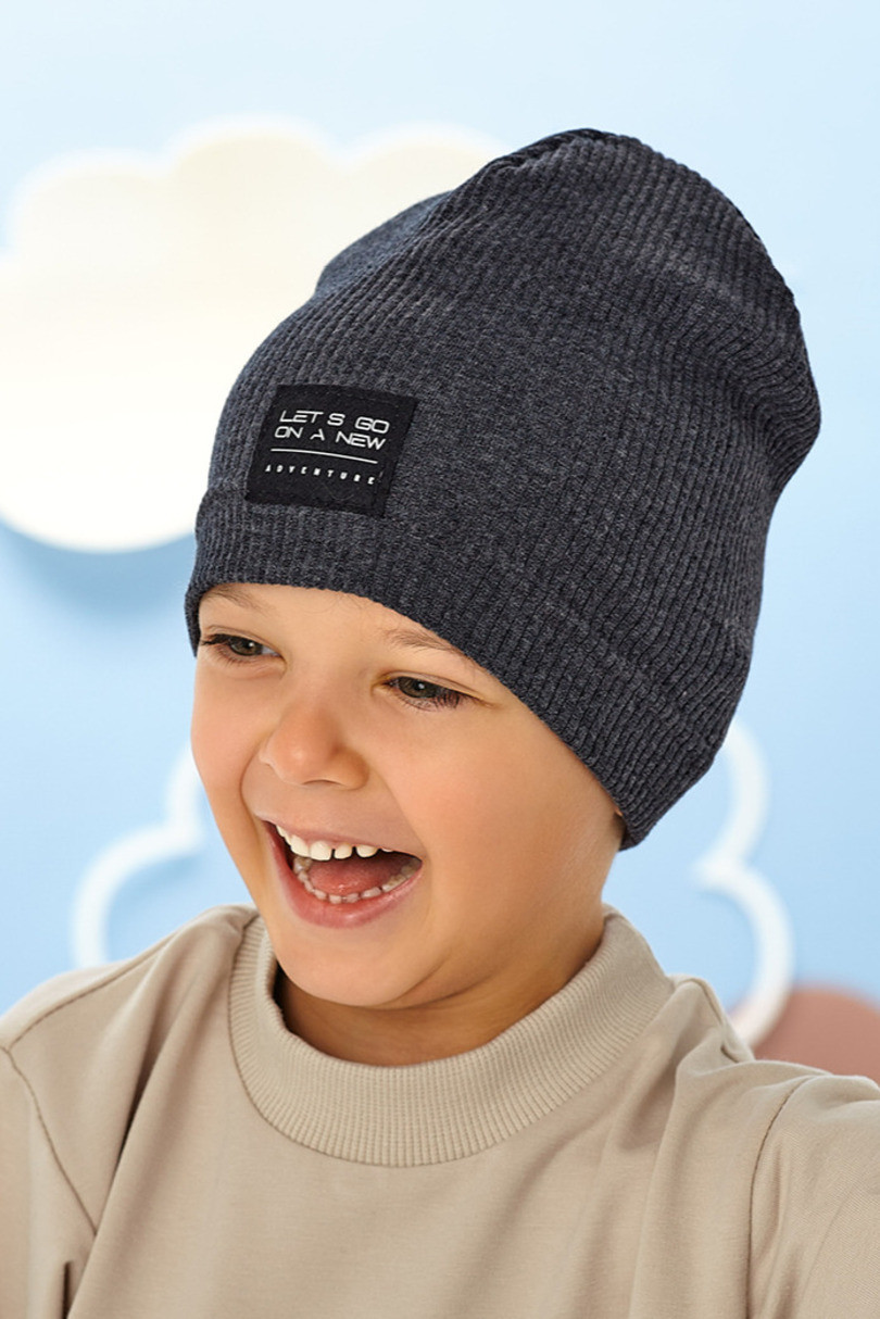 Chlapecká čepice z jedné vrstvy jemné žebrované bavlny, s malou nášivkou .