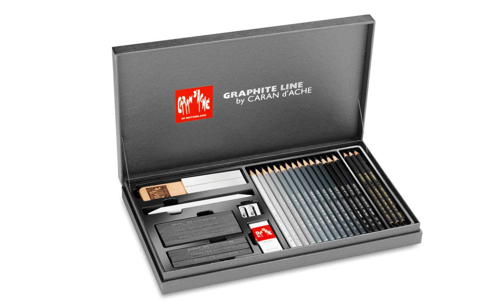 Oslavte umění světla a stínu se skicovací sadou Caran d’Ache Graphite Line. Sada obsahuje kompletní výběr tvrdostí grafitových tužek od ultra měkkého 9B po tvrdé 4H. Tužky jsou lakované odlišnými barvami, což umožňuje snadnou orientaci v jednotlivých tvrdostech. Použité cedrové dřevo má FSC certifikaci (pochází z lesů, kde se hospodaří trvale udržitelným způsobem). Sada nabízí vše potřebné pro široké spektrum technik – od ekonomického šrafování, psaní technických výkresů až po umělecké stínování, rozmazávání nebo pointilismus. Grafitová škála je navíc rozšířena o 3 vodou rozpustné tuhy Technalo (HB, B, 3B) pro akvarelové efekty, a 6 kusů Grafcube bloků ve dvou variantách (10 a 15 mm, s tvrdostmi 3B, 6B, 9B) pro ploché zapracování šedých tónů Nechybí ani praktické příslušenství: ořezávátko, těrka, brusný papír a technická pryž. Sada je vyroben ve Švýcarsku s důrazem na konzistentní kvalitu a vynikající kreslící vlastnosti. Balení je ideální pro profesionální ilustrátory, studenty uměleckých škol i techniky, kteří hledají dokonalý přechod od jemných čar po hluboké stíny. Tento kompletní set vám dá tvůrčí svobodu a precizní kontrolu nad každým dotykem grafitu s papírem.