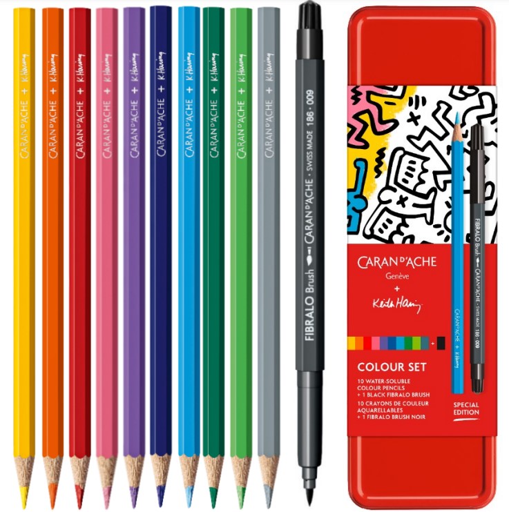 Keith Haring byl umělec a společenský aktivista. Jeho dílo bylo reakcí na pouliční kulturu New Yorku 80. let. Do dnes patří jeho grafické motivy mezi ikonická výtvarná zobrazení. Od kreseb v metru, bílou křídou až po malby na veřejných zdech, Keith Haring vyjadřuje univerzální jazyk, v němž symboly zdůrazňují otevřenost sdělení. Tato sada vznikla jako pocta Keithově práci. Jako mezigenerační kolekce vyzývající k oslavě lásky a umění. Setkání umělecké ikony a kreativní společnosti zaměřené na společné hodnoty. Sada je mimořádně vhodná jako krásný a stylový dárek pro všechny, kteří chtějí vyzkoušet akvarel nebo si osvojit nové dovednosti. Balení obsahuje: 1x akvarelový popisovač se štětečkovým hrotem, brush Fibralo v symbolické černé barvě 10x akvarelová pastelka s podpisem Keitha Haringa (limitovaná edice) Baleno ve sběratelském kovovém boxu s potiskem loga KH. Přepásáno kartonovým návlekem dekorovaným ikonou Keith Haring motiv a Caran d’Ache červenou barvou.