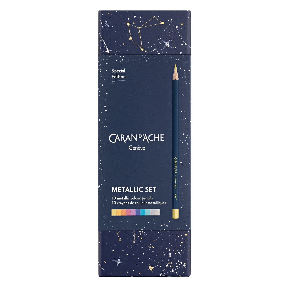 Vesmírné tajemství zachycené v každém tahu. To je limitovaná edice Cosmic Blue od prestižní švýcarské značky Caran d’Ache. Tato exkluzivní kolekce vznikla jako pocta lidské fascinaci vesmírem, jeho nekonečnými hloubkami a mystérii, která nás lákají poznávat neznámé. Kombinuje preciznost švýcarské výroby s moderním designem inspirovaným kosmickými motivy, a proto je naprosto jedinečnou volbou pro ty, kteří milují tvorbu bez hranic. Kolekce Cosmic Blue byla inspirována hvězdnými galaxií, nekonečným prostorem a hlubokou modří vesmíru. Každý produkt je ztvárněn v barevném tónu kosmického modrého odstínu s lesklými detaily, které evokují světlo hvězd. Caran d’Ache se při vývoji zaměřil na zachycení podstaty tohoto úchvatného motivu – nekonečnost, svobodu a kreativitu, kterou nám vesmír přináší. Každý kus této edice je pečlivě navržený a vyrobený s maximálním důrazem na detail. Pouze omezené množství kusů je dostupné po celém světě, což dělá tuto edici nejen jedinečnou uměleckou záležitostí, ale i cenným sběratelským kouskem. Sada obsahuje 10 ks metalických pastelek, v barevné kombinaci s 10 ks Neocolor I. (olejový pastel nerozmývatelný vodou). Metalické odlesky vyniknou na světlém i tmavém podkladu. Vysoce kvalitní dřevo pastelek s cerfikací FSC (dřevo pochází z lesů, kde se hospodaří trvale udržitelným způsobem), je lakováno sytě modrým lakem se zlatým ražením. Tuha je měkká o průměru 3,3 mm. Pastely mají syté a intenzivní pigmentování, které vytvoří na podložce kompaktní vrstvu se silnými metalickými odlesky. Všechny kreslící pomůcky jsou uloženy do luxusní kartonové, výsuvné kazetky, zdobené zlatými a stříbrnými motivy souhvězdí. Limitovaná edice je dostupná v omezeném počtu kusů, po vyprodání nebude dále dostupná. Pokud hledáte originální, sběratelský a umělecký kousek, je tato sada nejlepší volbou. Sada je mimořádně vhodná jako krásný a stylový dárek.