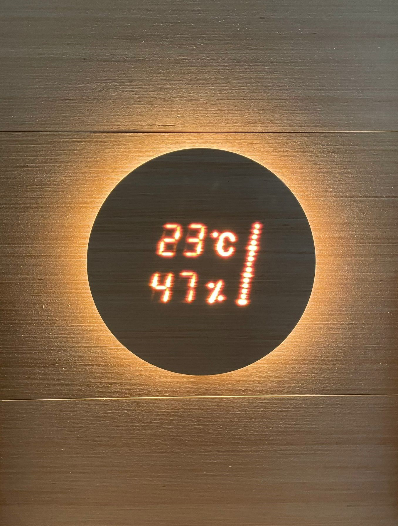 Cariitti Aspectu je nová pohodlná a bezpečná technologie, která promítá přes dřevěný panel digitální informace o teplotě a vlhkosti ve vaší sauně. Navíc se zobrazují i přesýpací hodiny s měřením času 15 minut. Dřevěný panel je vyroben ze dřeva Hemlock, průměr 230 mm.