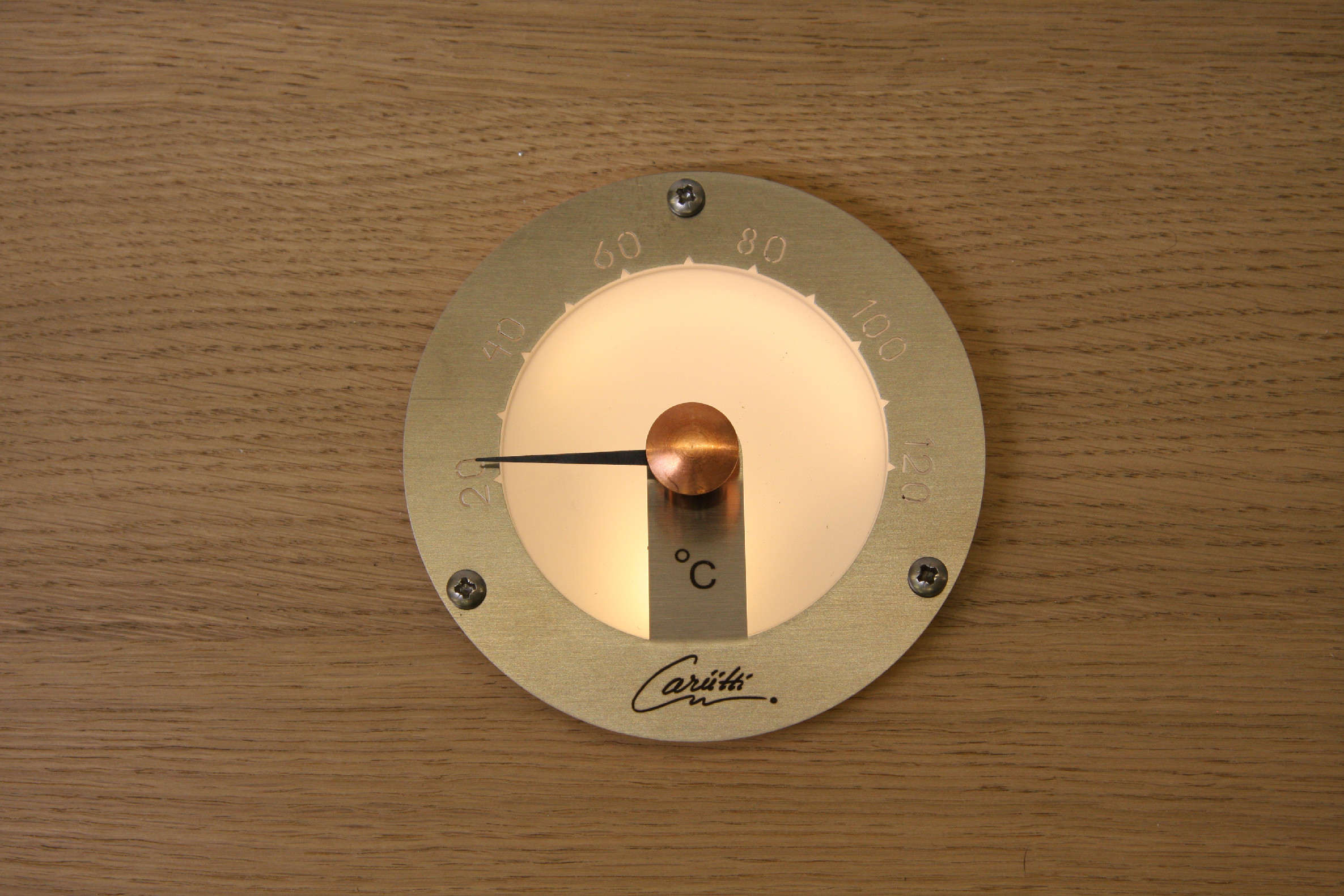 Kruhový teploměr do sauny Cariitti je vyroben z matného skla a nerezové oceli. Při použití projektoru se změnou barev vytváří krásný efekt. Na podsvícení doporučujeme 2-4 mm vlákno. Upevňuje se pomocí tří nerezových šroubů.