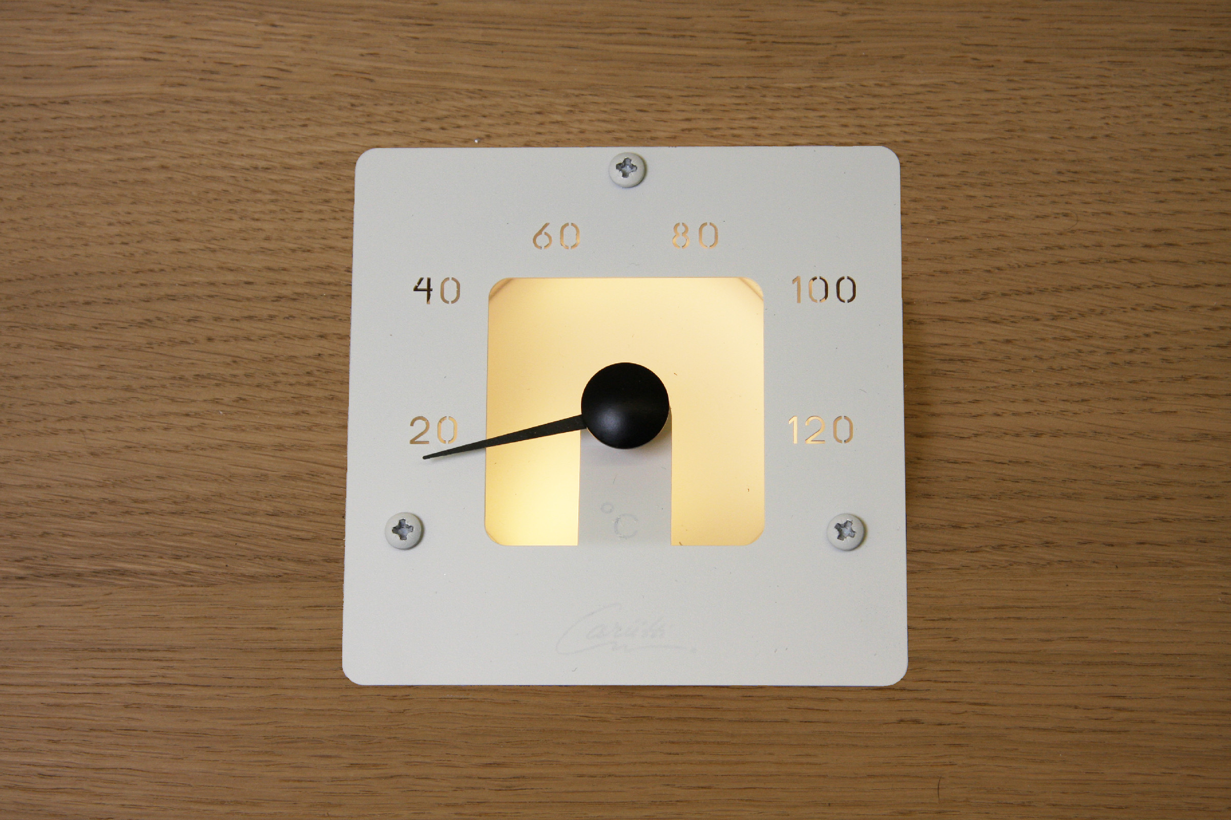 Tento čtvercový teploměr je vyroben z matného skla a nerezové oceli v bílém provedení. Teploměr je osvětlen jedním 2-4 mm vláknem. Upevňuje se pomocí tří nerezových šroubů.