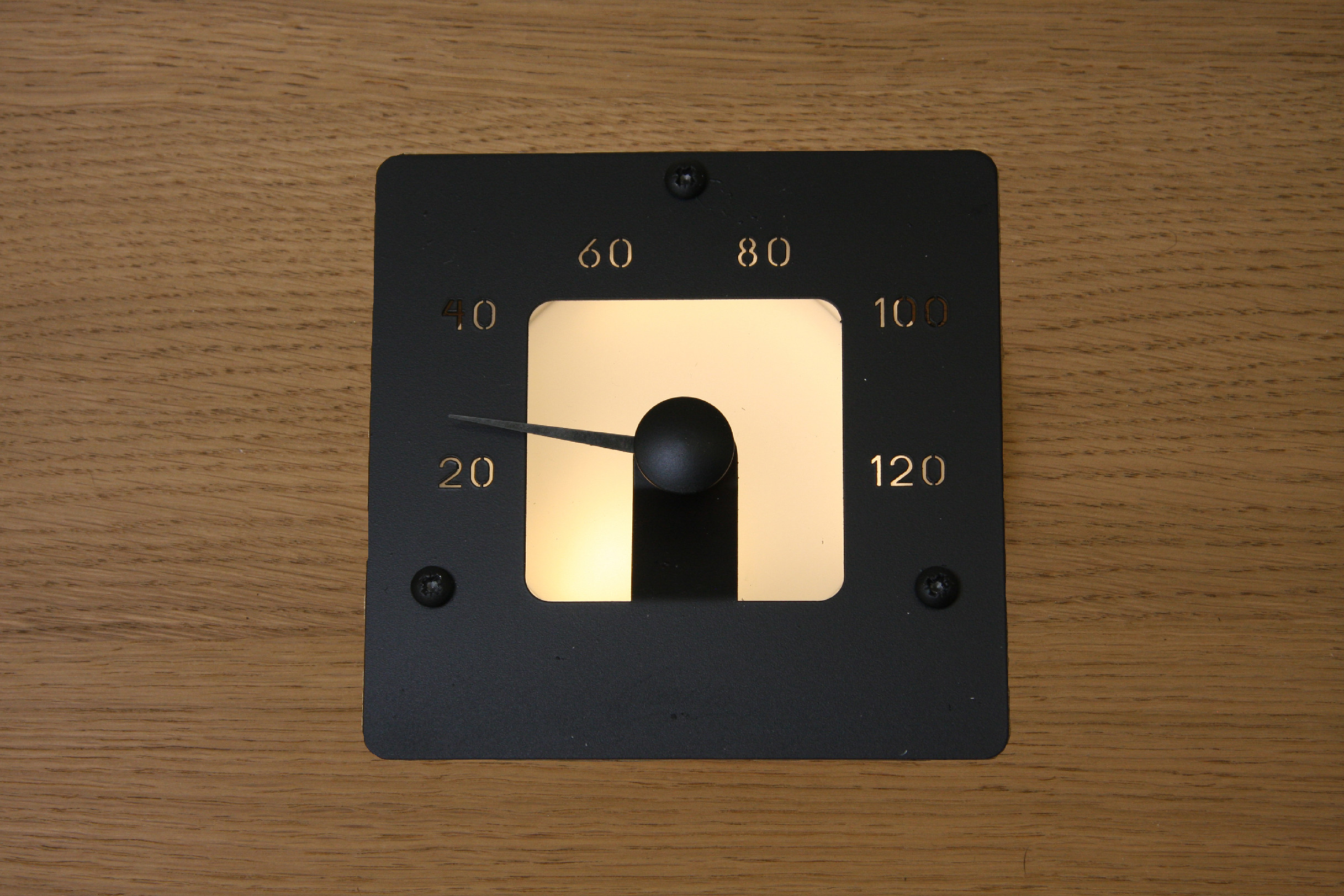 Tento čtvercový teploměr je vyroben z matného skla a nerezové oceli v černém provedení. Teploměr je osvětlen jedním 2-4 mm vláknem. Upevňuje se pomocí tří nerezových šroubů.