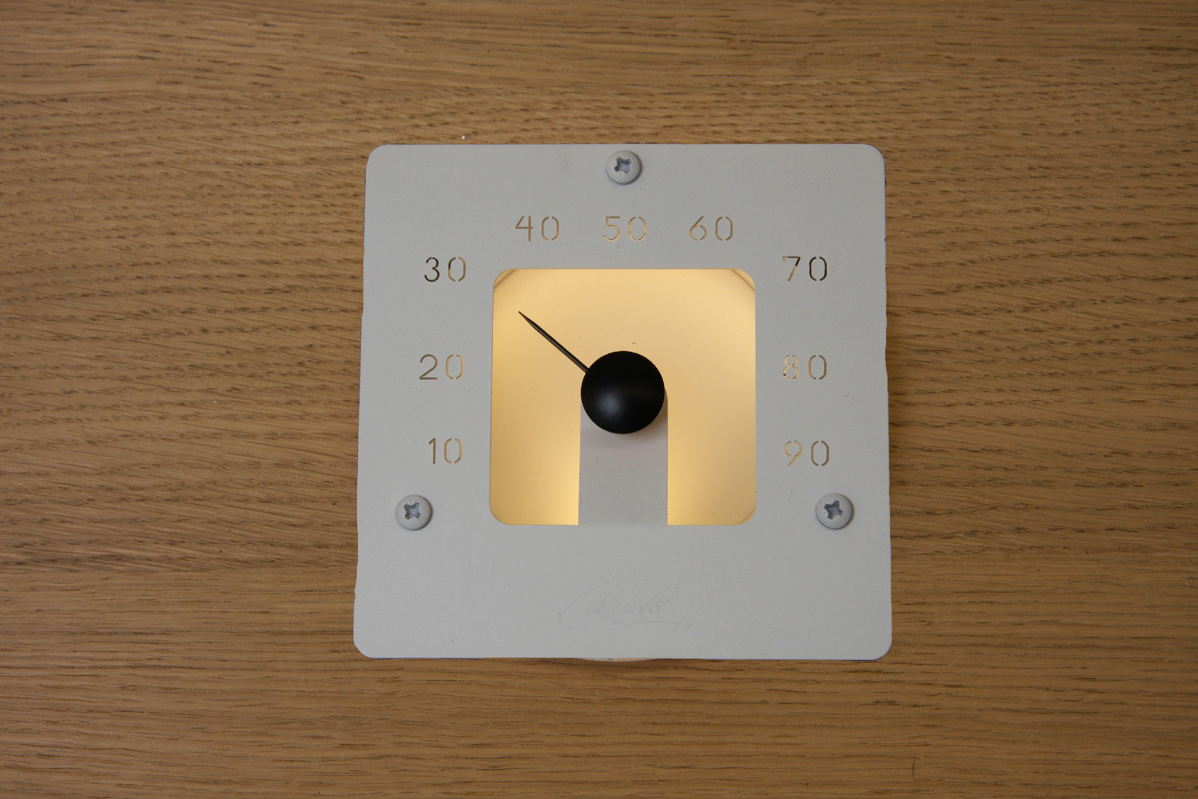 Tento čtvercový vlhkoměr je vyroben z matného skla a nerezové oceli v bílém provedení. Teploměr je osvětlen jedním 2-4 mm vláknem. Upevňuje se pomocí tří nerezových šroubů.