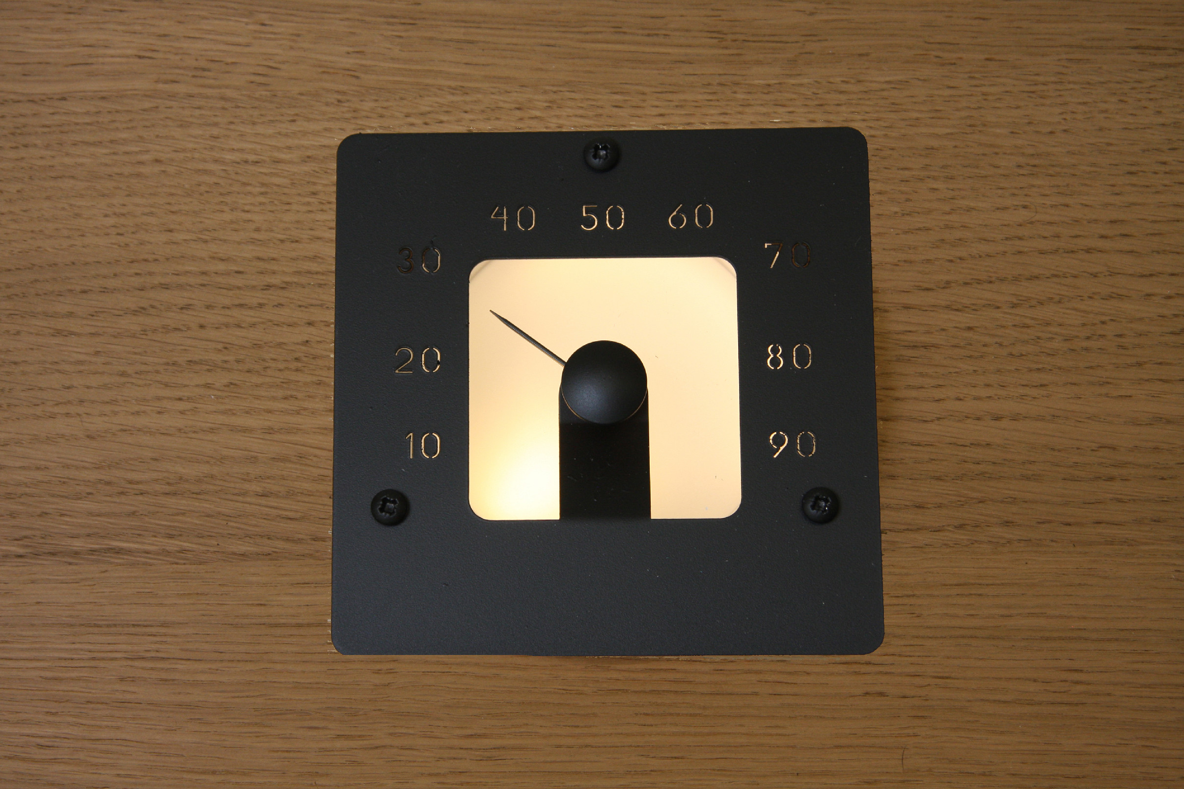 Tento čtvercový vlhkoměr je vyroben z matného skla a nerezové oceli v černém provedení. Teploměr je osvětlen jedním 2-4 mm vláknem. Upevňuje se pomocí tří nerezových šroubů.