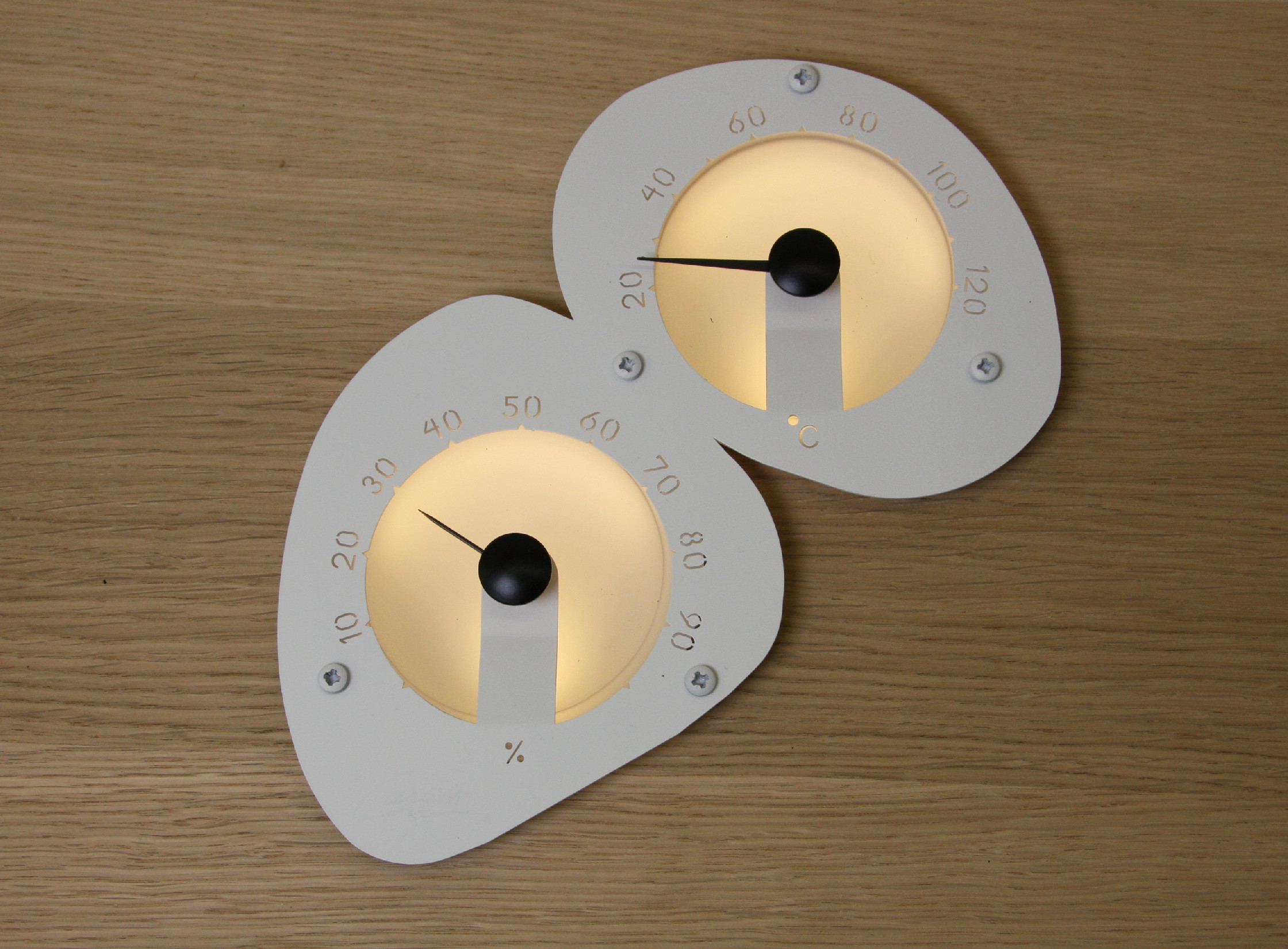 Kombinovaný teploměr a vlhkoměr do sauny. Je vyroben ze skla saténové barvy a nerezové oceli v bílém provedení. Je odolný vůči vysokým teplotám. Lze je krásně osvětlit dvěma skleněnými vlákny o průměru 2 - 4 mm. Upevňuje se pomocí pěti nerezových šroubů. Design: Frida Lindström.