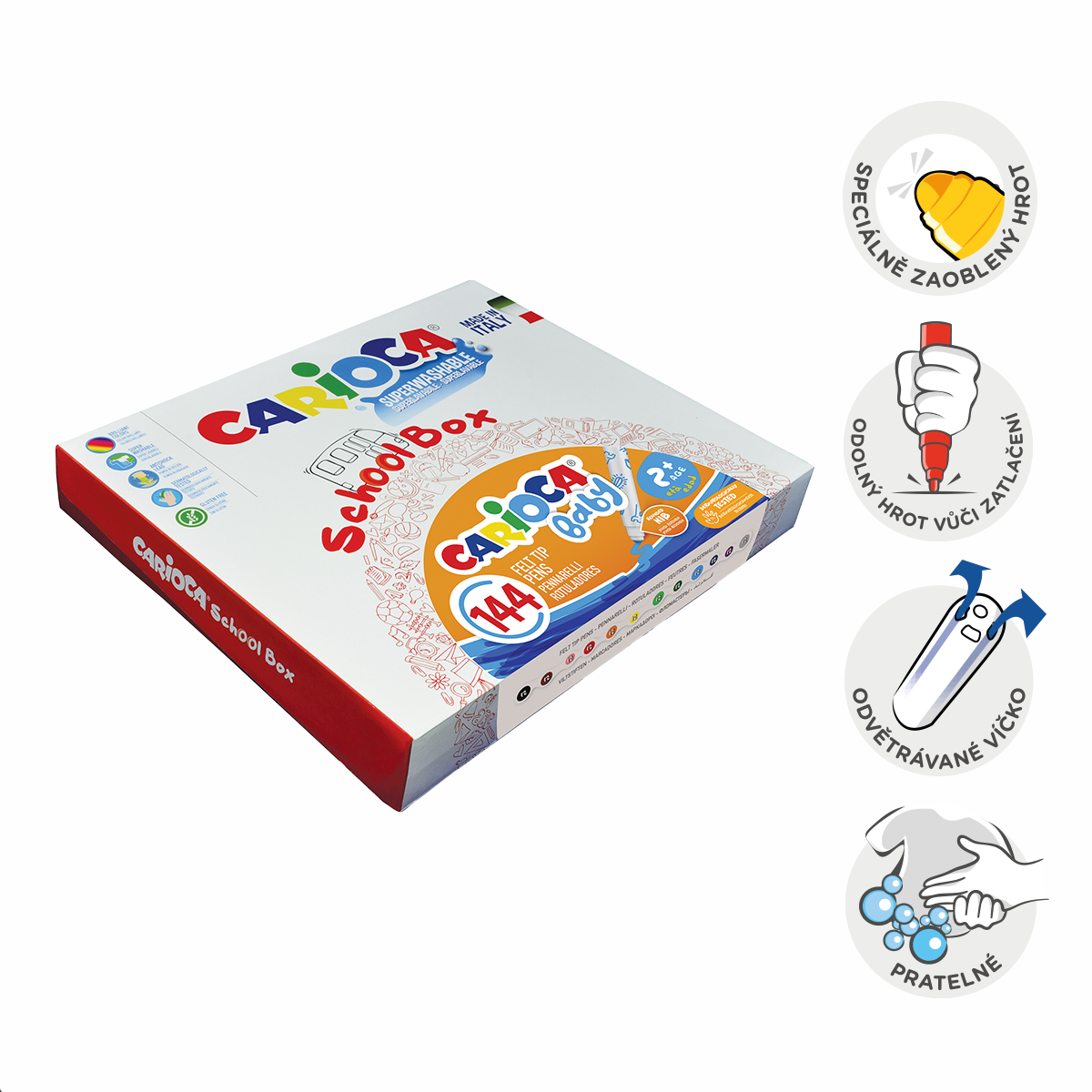 Perfektní společník pro děti od 24 měsíců, které objevují svět kreslení. Bezpečný zaoblený hrot je odolný proti vtlačení a odolá i tlaku dětských ručiček. Široké tělo umožňuje snadnou manipulaci a pohodlné vybarvování i větších ploch. Netoxický inkoust snadno odstraníte z pokožky a textilu vodou, takže se tvoření obejde bez starostí. Dermatologicky testované, odvětrávané víčko pro maximální bezpečnost. Velkokapacitní balení vhodné pro školky nebo výtvarné kroužky. U dětí mladších 3 let doporučujeme dohled dospělé osoby.kulatý, bezpečný hrot, odolný proti vtlačenídermatologicky testované, netoxický inkoust – bez obsahu formaldehydusnadno omyvatelnéodvětrávané víčkovhodné pro školky, výtvarné kroužkyvyrobeno v Itáliiobsah balení: 144 ks
