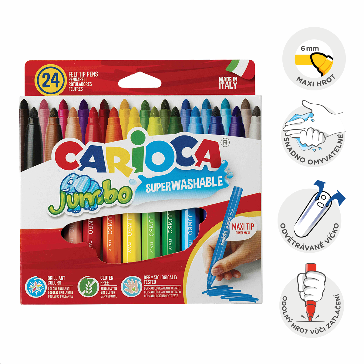 Fixy Jumbo s extra silným hrotem. Osmiúhelníkový tvar těla v maxi tloušťce pro snadné držení a zacházení. Vhodné pro běžné kreslení, do škol nebo výtvarných kroužků. Nevhodné pro děti do 3 let.odolný, extra silný hrot: ø 6 mmmaxi osmihranný tvar těladermatologicky testované, neobsahují lepeksnadno omyvatelné a pratelnéinkoust s dlouhou životností, jasné a zářivé barvyodvětrávané víčkovyrobeno v Itáliiobsah balení: 24 ks