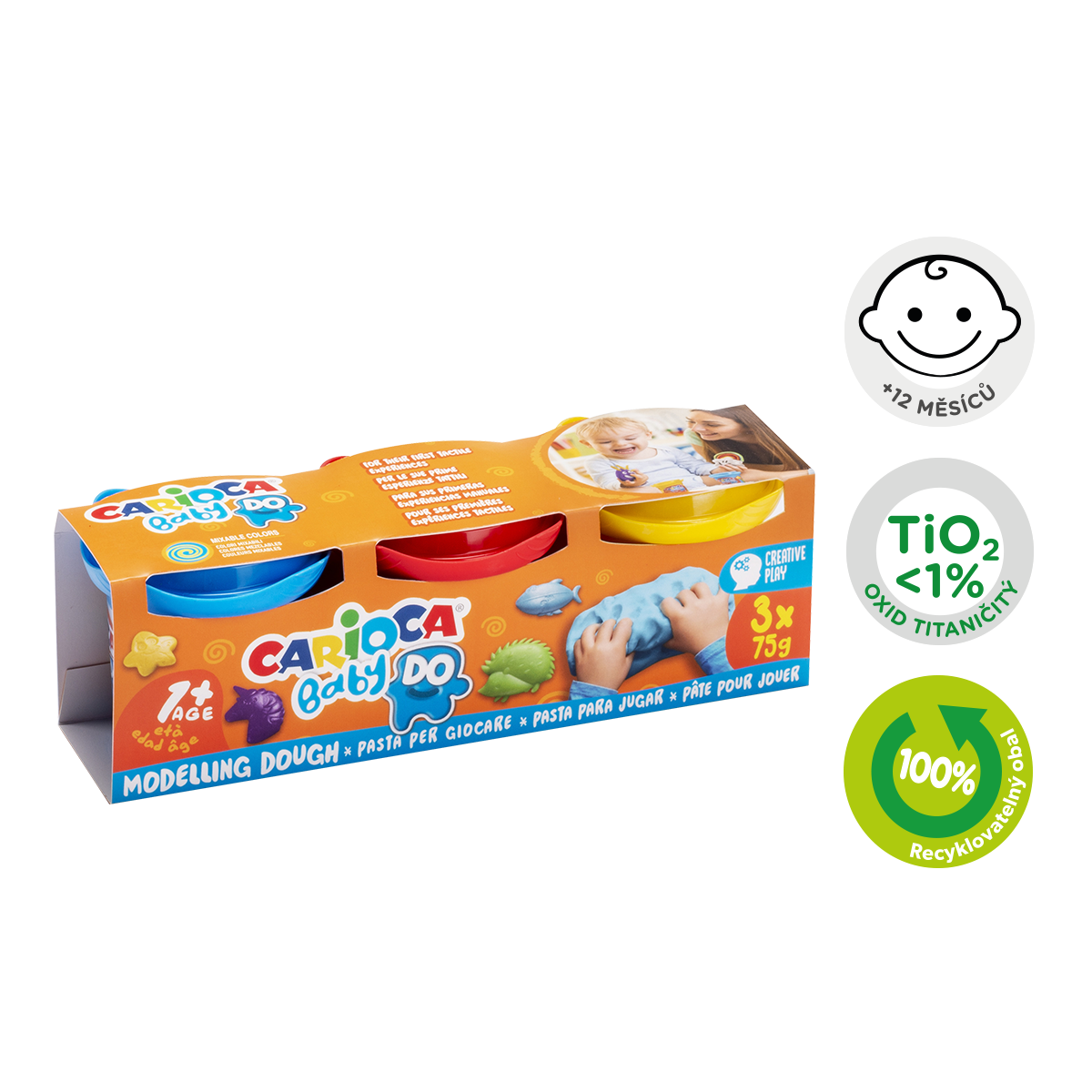 Modelovací hmota pro malé ručičky, která zaručí hodiny tvořivé zábavy! Vhodná pro malé objevitele od 12 měsíců pro rozvoj smyslového vnímání a hmatových dovedností. Praktický kelímek s hermetickým víčkem udrží hmotu čerstvou a poslouží i jako formička pro tvoření. Na vzduchu samo tvrdnoucí, bez nutnosti zapékání. Zářivé barvy lze snadno míchat mezi sebou a vytvořit si tak nekonečnou paletu odstínů. Ekologické složení na bázi vody, soli a pšeničné mouky je šetrné a bezpečné. U dětí mladších 3 let doporučujeme dohled dospělé osobypro děti od 12 měsícůrozvoj smyslového vnímáníhermetické víčko s formičkouna vzduchu samo tvrdnoucíjasné a zářivé barvy, lze míchat mezi sebounetoxické složení, velmi pružnáTiO2 < 1 %obsah balení: 3 × 75 g