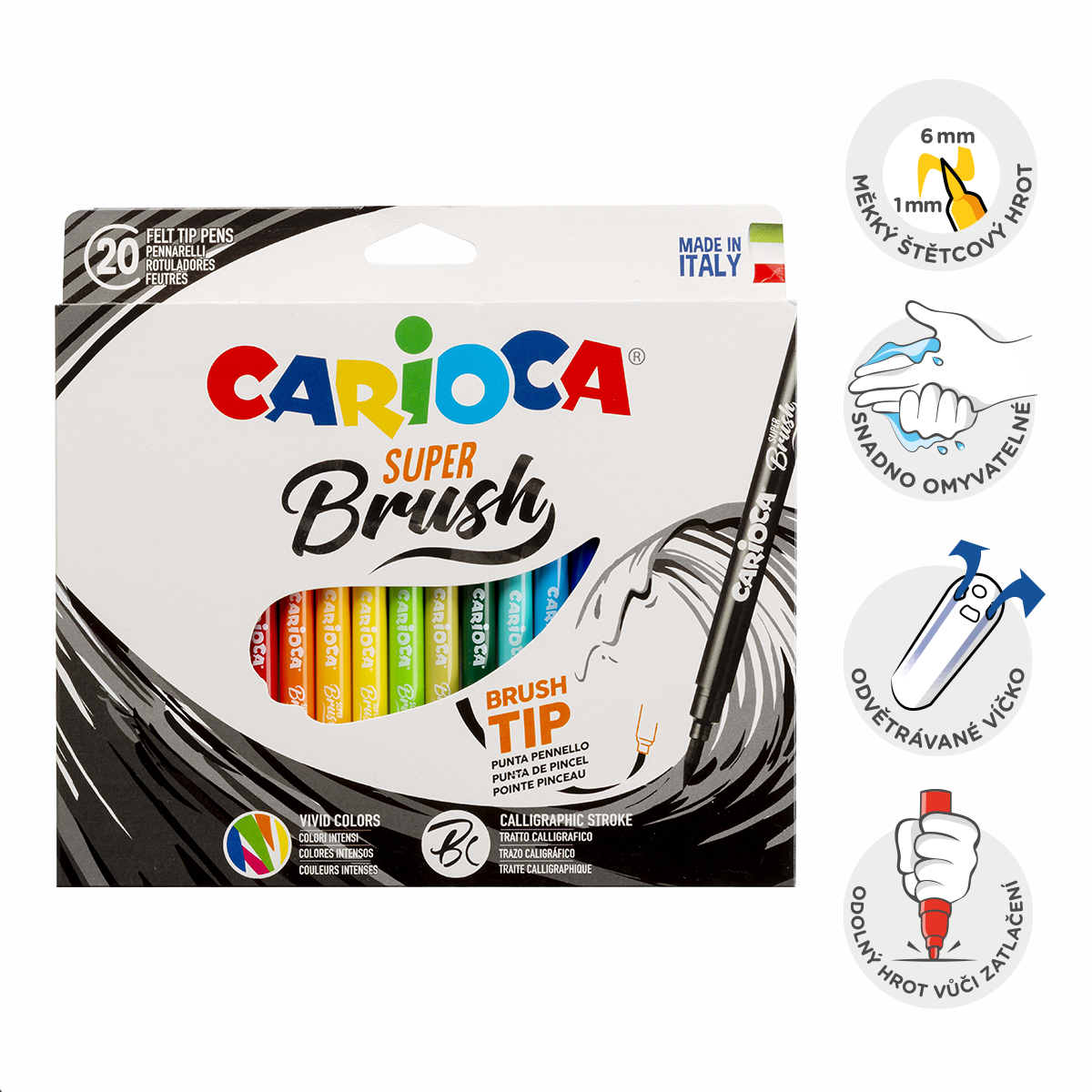 Fixy se štětcovým hrotem, který je měkký a snadno se přizpůsobí. Díky tlaku, který na hrot vyvinete, můžete vytvářet různě široké tahy nebo jemné linie. Skvěle se proto hodí pro kaligrafii, kreslení nebo barevné ilustrace. Nevhodné pro děti do 3 let.odolný štětcový hrot: 1 - 6 mmvhodné pro kaligrafii, kreslení, barevné ilustracepratelnéjasné a zářivé barvyodvětrávané víčkovyrobeno v Itáliiobsah balení: 20 ks