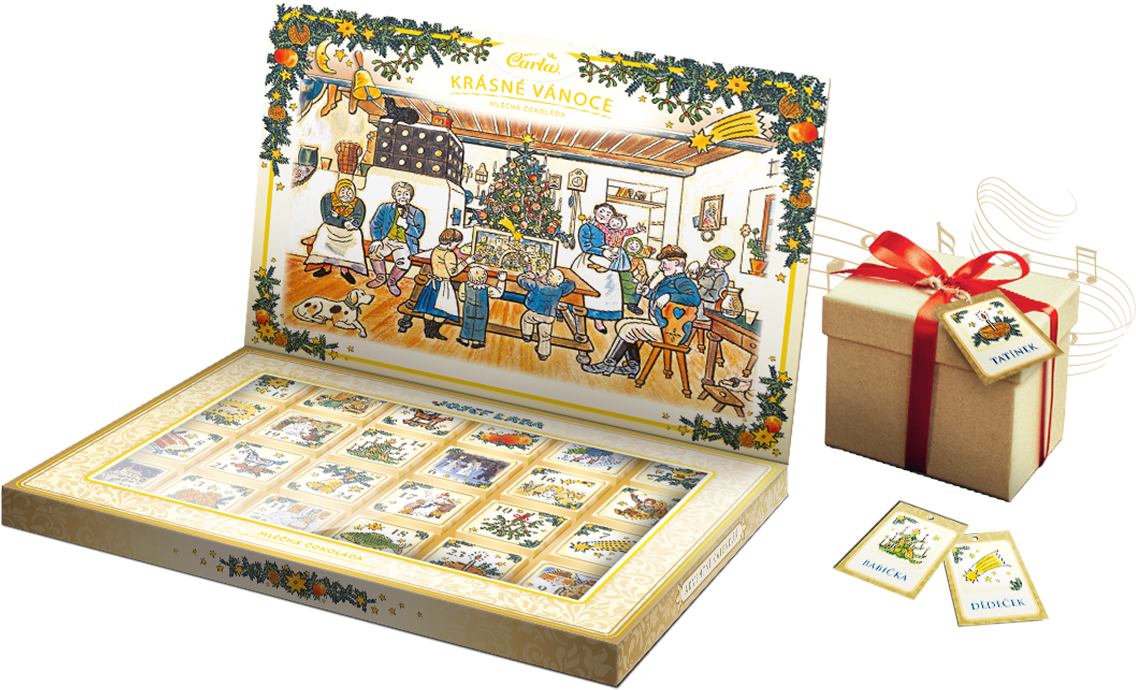 Smyslné sametově mléčné tóny čokolády. 24 mléčných čokoládek. Balení obsahuje jmenovky na vánoční dárky a také noty se slovy nejkrásnější české koledy. Složení: Cukr, kakaové máslo, sušené mléko plnotučné, kakaová hmota, emulgátory (sójový lecitin, polyglycerol-polyricin-oleát), vanilkové aroma. Alergeny jsou ve složení zvýrazněné tučně. Může obsahovat suché skořápkové plody. Obsah kakaové sušiny v mléčné čokoládě min. 32 %. 120g