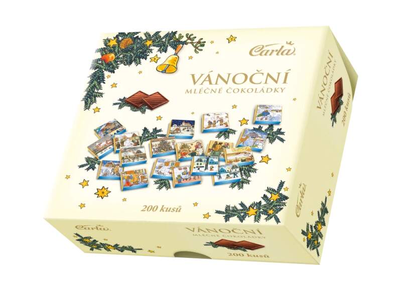 Krásné vánoční balení obsahuje 200 neapolitánek z mléčné čokolády v designu Josefa Lady. 200x5g Složení: Cukr, kakaové máslo, sušené mléko plnotučné, kakaová hmota, emulgátory (sójový lecitin, polyglycerolpolyricinoleát), vanilkové aroma.Alergeny jsou ve složení zvýrazněné tučně. Může obsahovat skořápkové plody. Obsah kakaové sušiny v mléčné čokoládě min. 32 %. Výživové údaje ve 100g: Energetická hodnota 2304 kJ / 552 kcal Tuky 33 g Z toho nas. mastné kyseliny 20 g Sacharidy 57 g Z toho cukry 56 g Vláknina 2,0 g Bílkoviny 6,4 g Sůl 0,1 g Výrobce: Carla Chocolate, Česká republika