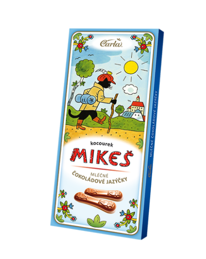 Čokoládové jazýčky z mléčné čokolády s motivem Kocourka Mikeše Obsah kakaové sušiny v mléčné čokoládě nejméně 32%. Složení: cukr, kakaové máslo, sušené mléko plnotučné, kakaová hmota, sušené mléko odstředěné, sušená syrovátka, laktóza, emulgátory (sójový lecitin, polyglycerol-polyricin-oleát), vanilkový extrakt bourbon madagascar. Obsah: 50g Vyrobeno v: České republice