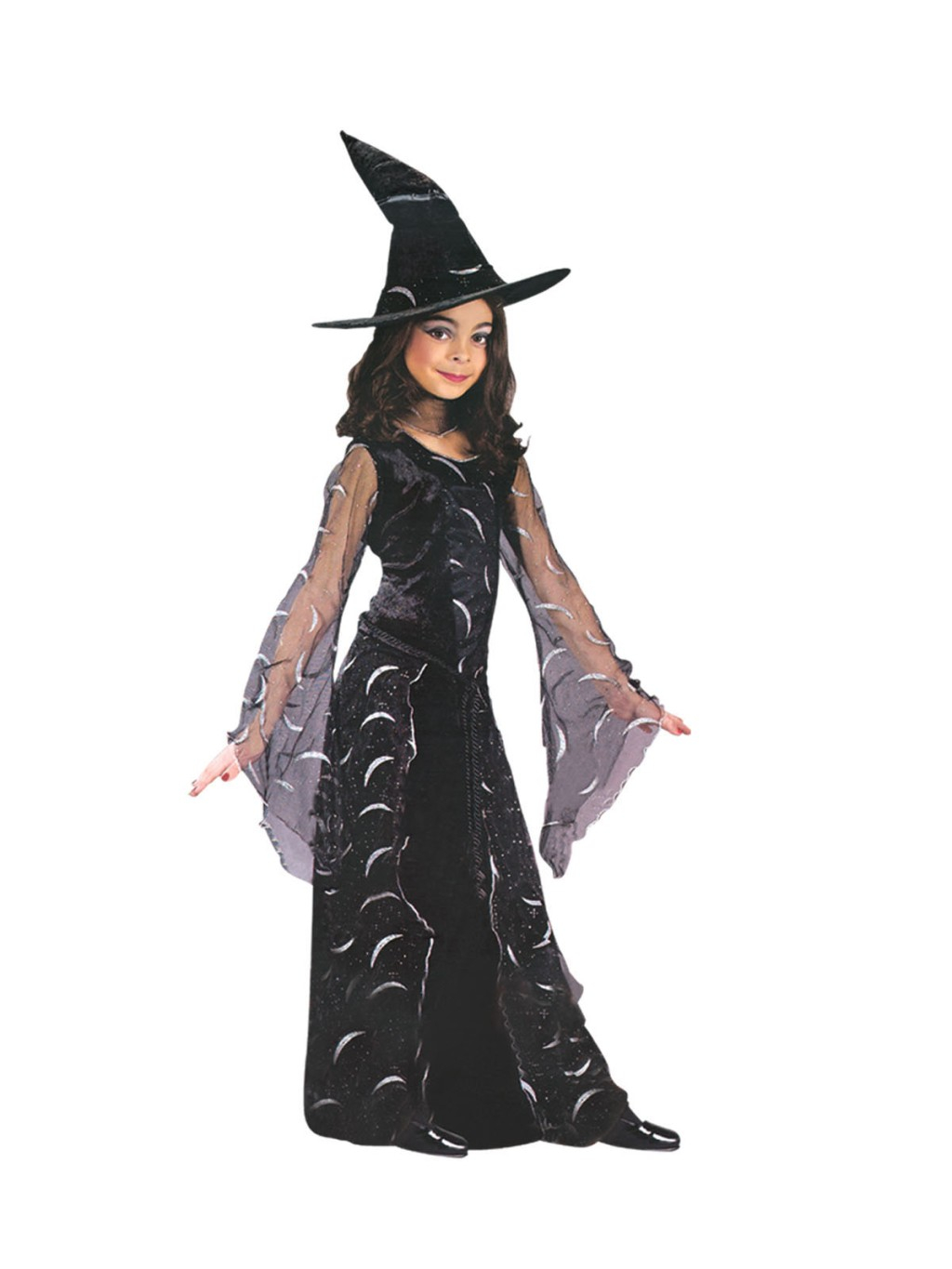 Čarodějnický kostým pro dívky ve věku cca 12–14 let. Sada obsahuje klobouk a kostým.