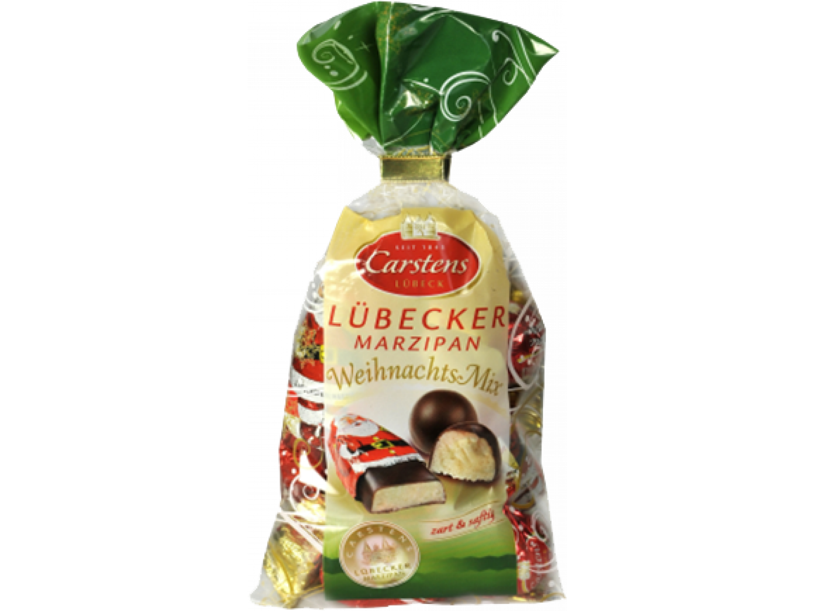 Samostatně balený vánoční mix z jemného jakostního marcipánu z Lübecku v jemné hořké čokoládě. 150g Marcipán 77% v hořké čokoládě Složení: cukr, mandle mleté 37%, kakaová hmota, voda, kakaové máslo, emulgátor sojový lecitin, zvlhčující látka.invertáza. Může obsahovat stopy lískových a vlašských ořechů, pistácií, pšenici, ječmen, sojů mléko a vejce Rozměry v mm: 60×170×40