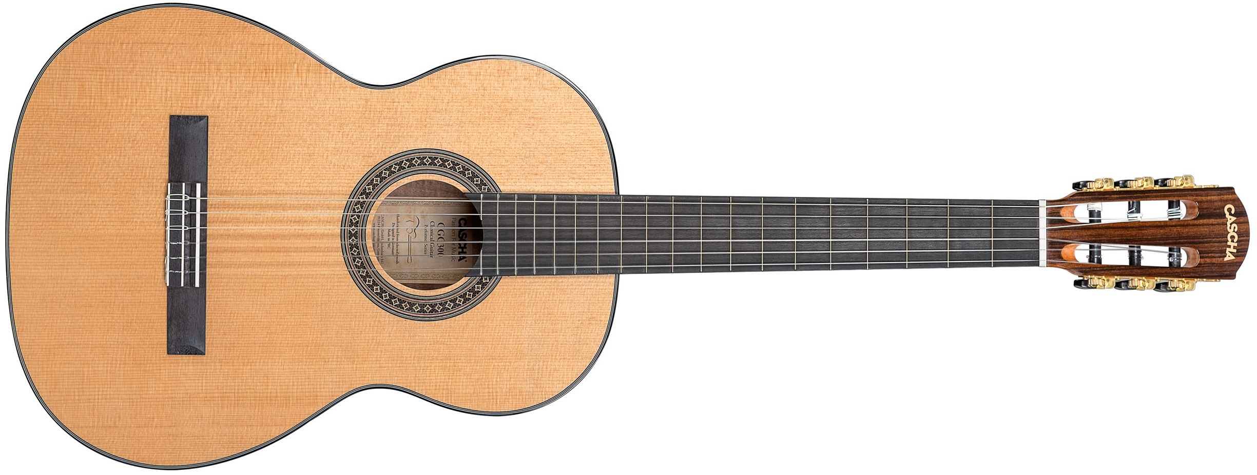 Klasická kytara Klasická kytara Cascha Performer Series je cenově dostupný nástroj vhodný pro začátečníky, který použitými materiály a zpracováním převyšuje základní “entry level” nástroje. Přední deska kytary je zhotovena z laminovaného smrku, zadní deska a luby z laminovaného palisandru. K mahagonovému krku je přilepen hmatník ze dřeva purpleheart/amaranth osazený osmnácti pražci. Struny jsou uchyceny v klasických otevřených mechanikách a kobylce z purpleheartu. Pěkné zpracování podtrhuje lesklý finiš pře