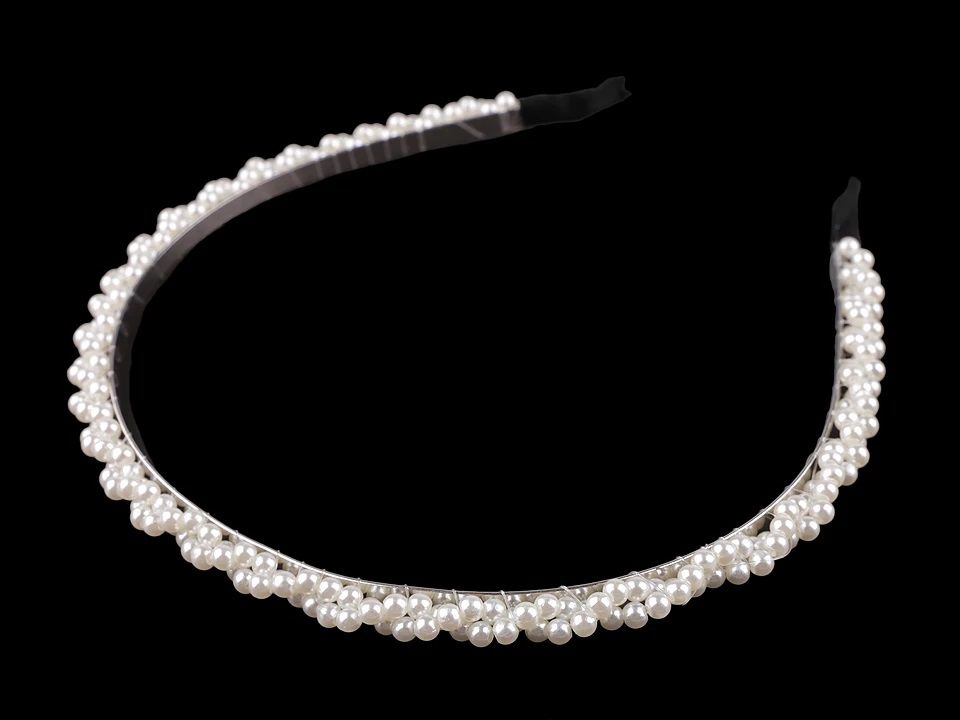 Hodí se jako doplněk do vlasů pro nevěsty a družičky, ale také na slavnostní příležitost jako jsou křtiny, narozeniny, různé party, plesy a večírky. Na kovovém základu širokém 5 mm jsou pevně připevněné skleněné perličky s perlovým leskem, ve dvou zkroucených řadách.