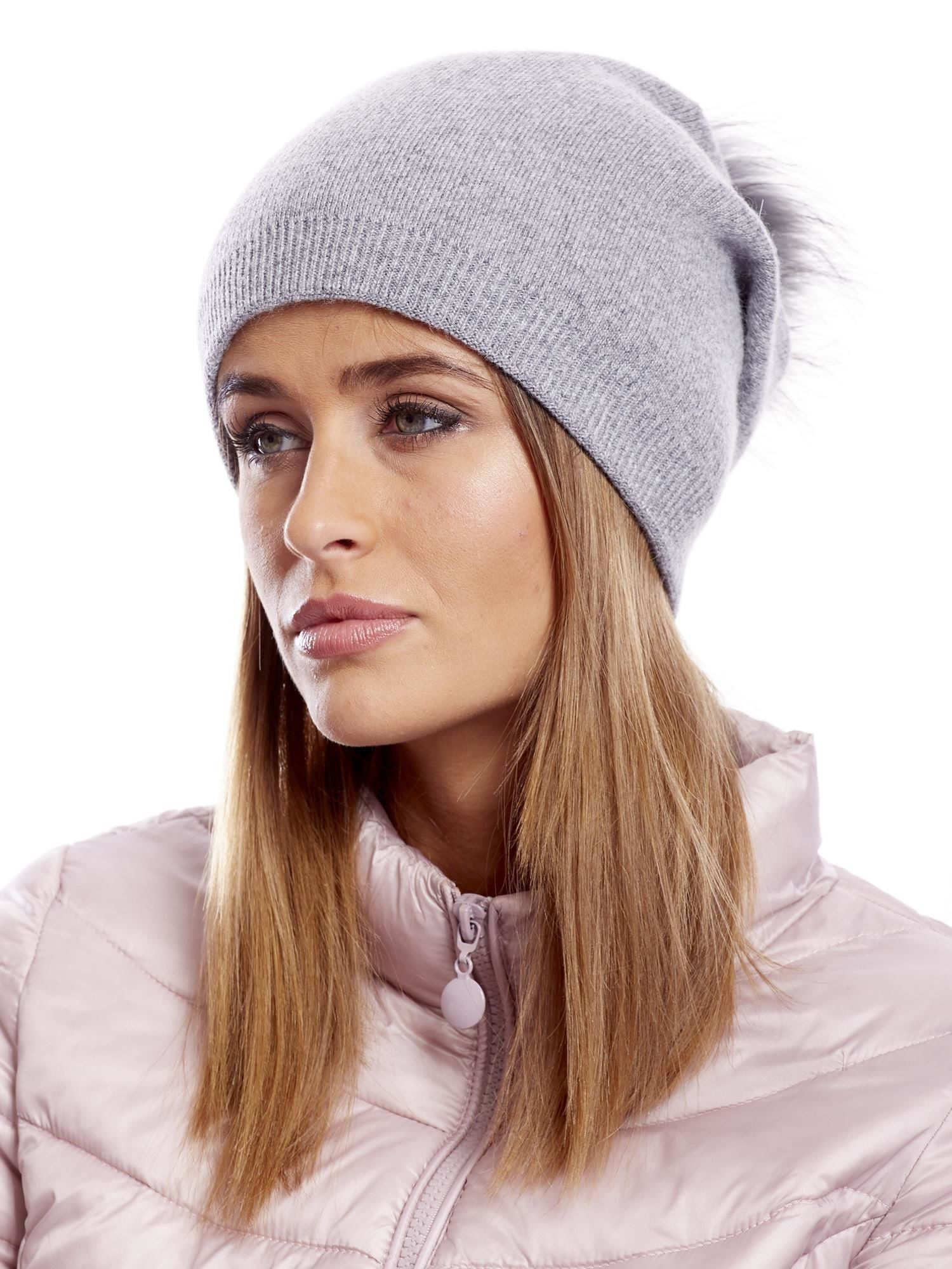 Dámská čepice s kožešinovou bambulí světle šedá doplňky: přírodní kožešinová bambule materiálové složení: 30 % kašmír, 70 % akryl způsob praní: praní v pračce na 30 °C