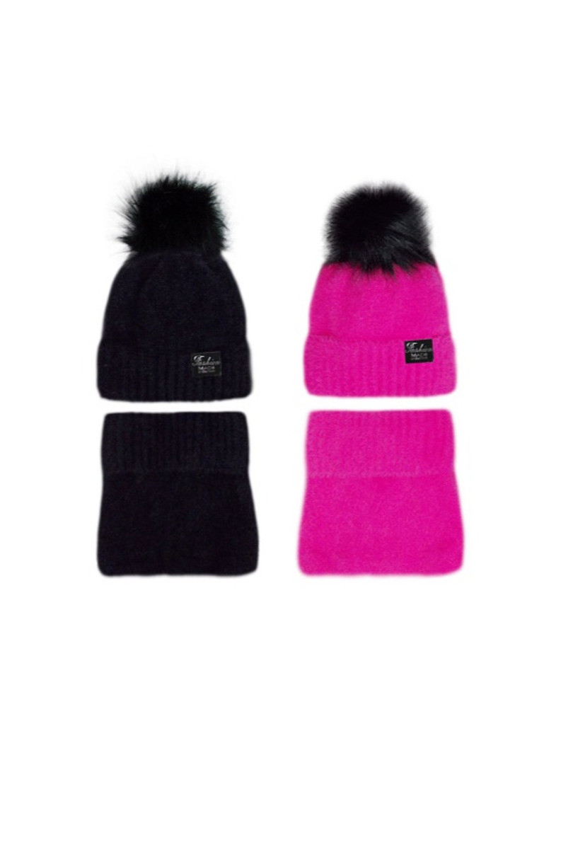 Dámský komplet: čepice z huňatého polyamidu s bavlněnou podšívkou, ohrnutá s huňatou bambulí plus komín. .