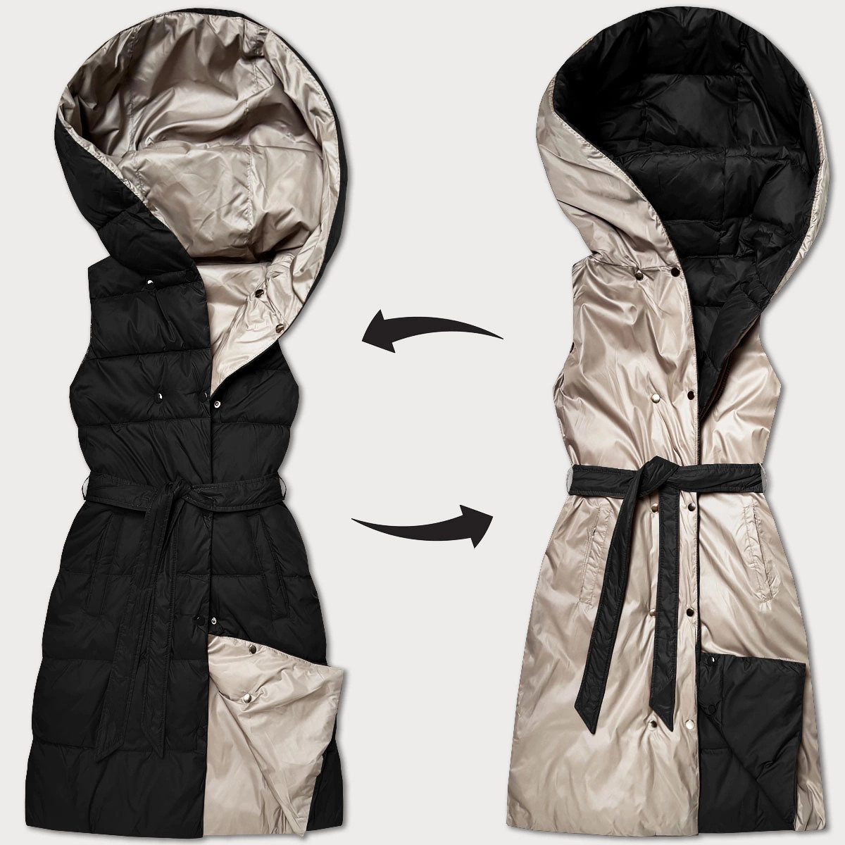 Domů Oblečení a móda Dámské oblečení Dámské vesty Černo-béžová oboustranná péřová vesta Minority (P3-6016-1+62) odstíny béžové M (38)