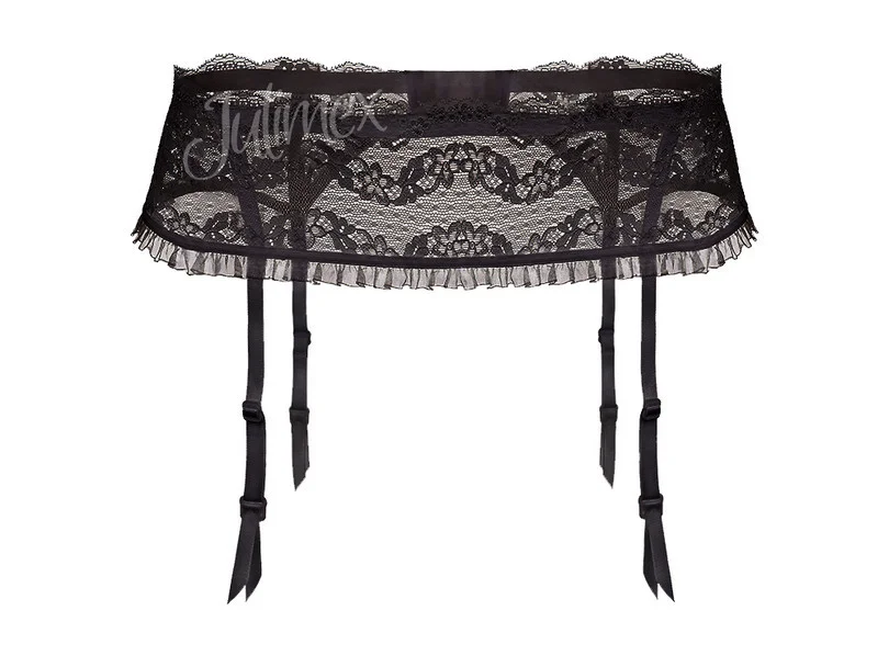 Široký dámský krajkový podvazkový pás s květovanými řetízky na jemné síťovině. Spodní okraj modelu je olemovaný mistrovským volánkem. Popruhy k punčochám a zapínání je možné nastavit. Model je elegantní a působí velmi žensky. Složení: 88 % polyamid, 12 % elastan.