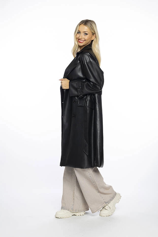 Věnujte prosím pozornost při výběru velikosti dle velikostní tabulky uvedené níže. Velikosti neodpovídají běžně nošené konfekci. Kabát s límcem Kabát má podšívku, pásek pro zavazování, dvě kapsy a zapíná se knoflíky. Ve spodní části modelu je vzadu rozparek. Model má délku ke kolenům. Složení: vrchní vrstva - 100 % PU, podšívka - 100 % polyester.