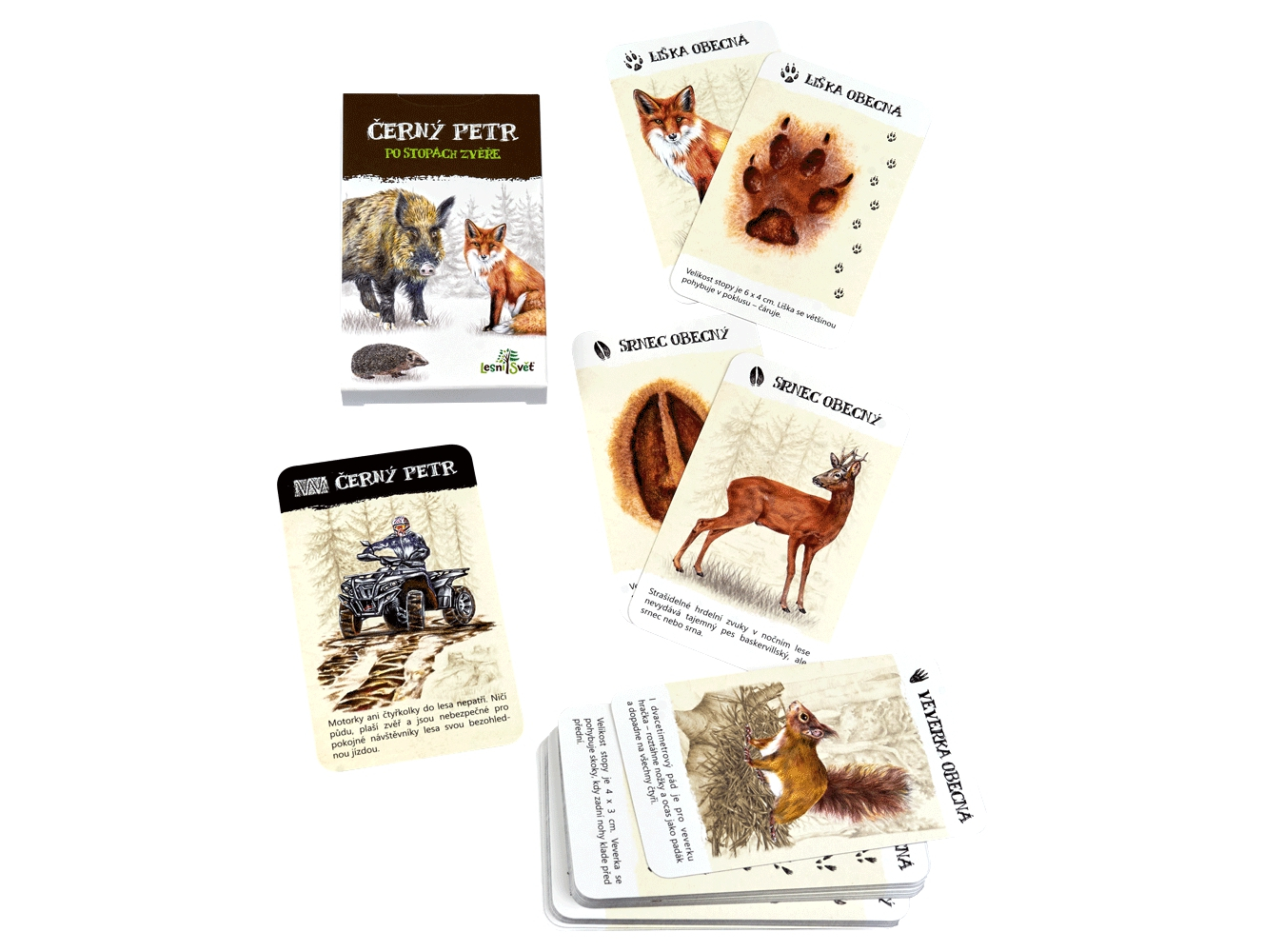 Vytištěno na ekologickém papíře s certifikátem PEFC. Balení obsahuje 33 herních karet. Rozměr karty: 6 cm x 10 cm Nemá ochranný obal. Autorem kreseb jsou čeští ilustrátoři, obrázky jsou chráněny autorskými právy. Černý Petr zábavnou a hravou formou seznamuje děti i dospělé s přírodou. Pár tvoří lesní zvíře a jeho stopa. Hra pro 3 - 4 hráče. Lesní svět = značka s ekologickým certifikátem udržitelného hospodářství PEFC. Všechny výrobky jsou vyrobeny s ohledem na životní prostředí.