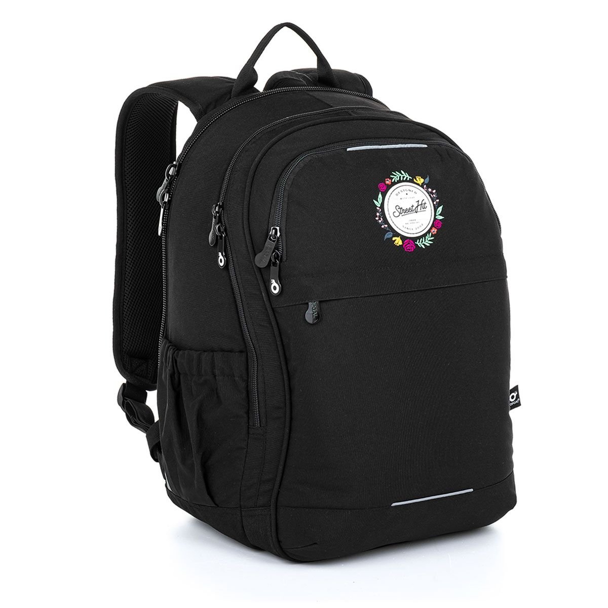 Hlavní charakteristika: váží 880 gramů má pevná lisovaná záda z měkké pěny dvě komory, dvě přední kapsy výškově nastavitelná hrudní přezka polstrované měkké ramenní popruhy reflexní prvky zátěr proti dešti pevné dno z materiálu TOPDURA poutko na zavěšení na lavici i přenos batohu v rukou Dvoukomorový batoh v temně černé barvě, oživený vyšitými květy a stylovou nášivkou. Záda batohu jsou polstrovaná a anatomicky tvarovaná z měkké pěny. Uvnitř zadní komory je umístěna polstrovaná kapsa na notebook i tablet. Kromě dvou hlavních komor má batoh dvě přední kapsy, do kterých se krásně vejde ETUE 23026 ve stejném designu. Součástí jedné z nich je síťovaná kapsa na doklady a karabinka na klíče. Reflexní prvky jsou zakomponovány tak, aby nenarušily celkový vzhled batohu. Postranní kapsičky na lahev s pitím jsou vyrobeny ze stejného materiálu jako batoh, aby bez problémů udržely 1,5 litrovou láhev.