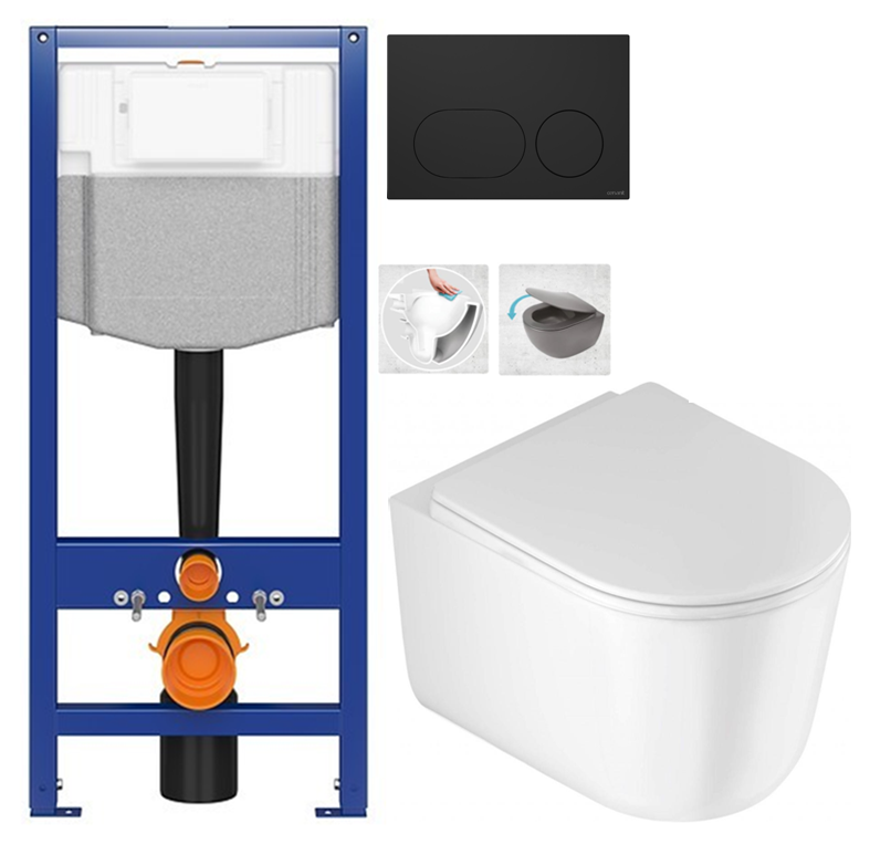 Podomítkový systém SYSTEM 50 MECH (K97-526) Zapuštěný systém pro suchou instalaci. Odolný, rám 50 cm. Zaručuje dlouhodobé a bezproblémové používání. Vlastnosti: • mechanické spouštěcí tlačítko• nastavitelný tlak mycí vody na mycím ventilu• rám z profilů 40 x 40 mm, práškově lakovaná ocel• brzda v nohách rámu• 4-cestné nastavení hloubky výstupního kolena umožňuje• nohy pozinkovaného otočného rámu se 4 montážními polohami• montážní systém QUICK FIX s mikronastavením• velmi tichý plnicí ventil, NF certifikovaný, s mosazným připojovacím hrotem• součástí balení FRESH SYSTEM hygienický SYSTÉM• montáž předního ovládacího tlačítka• připojení 2-bodové přívod vody do nádrže (centrální nahoře, centrální vzadu)• kompatibilní s duálním splachovacím systémem: 2/4L, 3/5L (tovární nastavení) nebo 3/6L• snadné nastavení vnitřních mechanismů • opravitelný úhlový uzavírací ventil• barevné kódování pro usnadnění procesu instalace• široká škála ovládacích tlačítek na výběr Ovládací tlačítko DUETO k systému AQUA, černá mat (K97-0637) plastové, dvojčinné černý mat rozměr: 22 x 15 cm Ovládací tlačítko k podomítkovému WC modulu se nachází na stěně nad WC mísou a slouží k ovládání splachování vody. Jasmin bílá - záchodová mísa, nástěnná, bez oplachového kruhu (CDJD6ZPW) Bílá toaletní WC mísa JASMIN, vyrobená z prvotřídní keramiky bez oplachového kruhu, která usnadňuje udržování čistoty a hygieny. Laboratorně testovaný materiál časem nepraská ani nezmění barvu, takže vaše toaleta bude i po letech vypadat jako nová. Díky klasickému designu se záchodová mísa JASIN hodí do každého stylu interiéru. Součástí je záchodové sedátko s pomalým zavíráním a systémem upevnění, který umožňuje rychlé a snadné odpojení a instalaci sedátka bez nutnosti použití nářadí. šířka: 36 cm hloubka: 49 cm výška: 31 cm Antibakteriální povlak zabraňuje růstu mikroorganismů a podporuje hygienu. Díky tomu se můžeme vyhnout mnoha infekcím. Antibakteriální povlak je také spojencem při každodenním čištění.