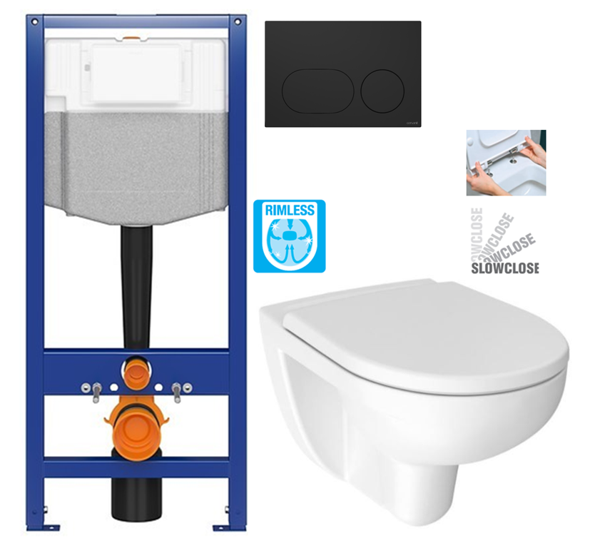 Podomítkový systém SYSTEM 50 MECH (K97-526) Zapuštěný systém pro suchou instalaci. Odolný, rám 50 cm. Zaručuje dlouhodobé a bezproblémové používání. Vlastnosti: • mechanické spouštěcí tlačítko• nastavitelný tlak mycí vody na mycím ventilu• rám z profilů 40 x 40 mm, práškově lakovaná ocel• brzda v nohách rámu• 4-cestné nastavení hloubky výstupního kolena umožňuje• nohy pozinkovaného otočného rámu se 4 montážními polohami• montážní systém QUICK FIX s mikronastavením• velmi tichý plnicí ventil, NF certifikovaný, s mosazným připojovacím hrotem• součástí balení FRESH SYSTEM hygienický SYSTÉM• montáž předního ovládacího tlačítka• připojení 2-bodové přívod vody do nádrže (centrální nahoře, centrální vzadu)• kompatibilní s duálním splachovacím systémem: 2/4L, 3/5L (tovární nastavení) nebo 3/6L• snadné nastavení vnitřních mechanismů • opravitelný úhlový uzavírací ventil• barevné kódování pro usnadnění procesu instalace• široká škála ovládacích tlačítek na výběr Ovládací tlačítko DUETO k systému AQUA, černá mat (K97-0637) plastové, dvojčinné černý mat rozměr: 22 x 15 cm Ovládací tlačítko k podomítkovému WC modulu se nachází na stěně nad WC mísou a slouží k ovládání splachování vody. Lyra plus Závěsné WC, 530x360 mm, Rimless, bílá (H8213840000001) šířka: 360 mm hloubka: 530 mm výška: 355 mm materiál: sanitární keramika vodorvný odpad Rimless /bez oplachového kruhu/ hluboké splachování pro splachování 4,5-3 litry WC kombi RIMLESS /bez splachovacího kruhu/ = je moderní systém splachování, který se charakterizuje znamenitou funkčností a vysokou hygienou oproti běžným klozetům se splachovacím kruhem. U běžných klozetů může docházet k zachycování nečistot ve splachovacím kruhu pod okrajem mísy. Současný systém zajišťuje dokonalý rozvod vody a jednoduché čištění - veškerý prostor uvnitř mísy je smaltovaný a jednoduše čistitelný. Lyra plus WC sedátko s poklopem, Slowclose, bílá (H8903850000631) hloubka 445 mm šířka 370 mm výška 20 mm duroplastové odnímatelné (sedátko lze jednoduše sejmout/nasadit) nerezové úchyty Slowclose (zpomalující sklápění sedátka)