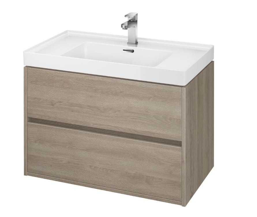 SET B115 CREA 80, dub (skříňka+umyvadlo) (S801-289) Součástí sestavy je závěsná umyvadlová skříňka CREA 80 s nábytkovým umyvadlem CREA 80. Čelo a korpus skříňky jsou vyrobeny z dřevotřísky odolné proti vlhkosti dub v barvě dubu. Skříňka je vybavena systémem dotykového otevírání (tzv. PUSH SYSTEM) a dvěma prostornými zásuvkami. Šedá struktura lnu dodává skříni další elegantní vzhled. Umyvadlo CREA je vyrobeno z keramické hmoty ROCKLITE, díky čemuž je překvapivě odolné, lehké a s extrémně tenkými stěnami. Skříňka: Výška: 53,3 cm Šířka: 79,4 cm Hloubka: 45 cm Baleno: ve smontovaném stavu Závěsná umyvadlová skříňka CREA 80 se dvěma výsuvnými boxy v dubovém provedení, vyrobená moderní technologií AQUASAFE /zvýšená odolnost proti vlhkosti/. Skříňka působí elegantním vzhledem díky zapuštění přední části a využití skrytých madel. Zásuvky jsou vybavené pojezdy "HAFELE" s plným výsuvem a tichým uzavíracím systémem, který zvyšuje komfort používání. Umyvadlo: Šířka: 80,5 cm Hloubka: 45,5 cm Hmotnost: 23,5 kg Nábytkové umyvadlo CREA 80 s přepadem a otvorem na armaturu. Cena bez baterie a výpusti.