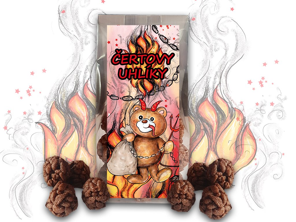 Čertovy uhlíky - Křupavé kakaové kuličky bez lepku jako čertovsky originální dárek do mikulášské nadílky. Složení: Rýžová mouka 80%, třtinový cukr, kakao 4,6%, sůl, kokosový tuk, kukuřičný sirup, agáve sirup wild. Bez lepku. Hmotnost: 30g Vyrobeno v ČR