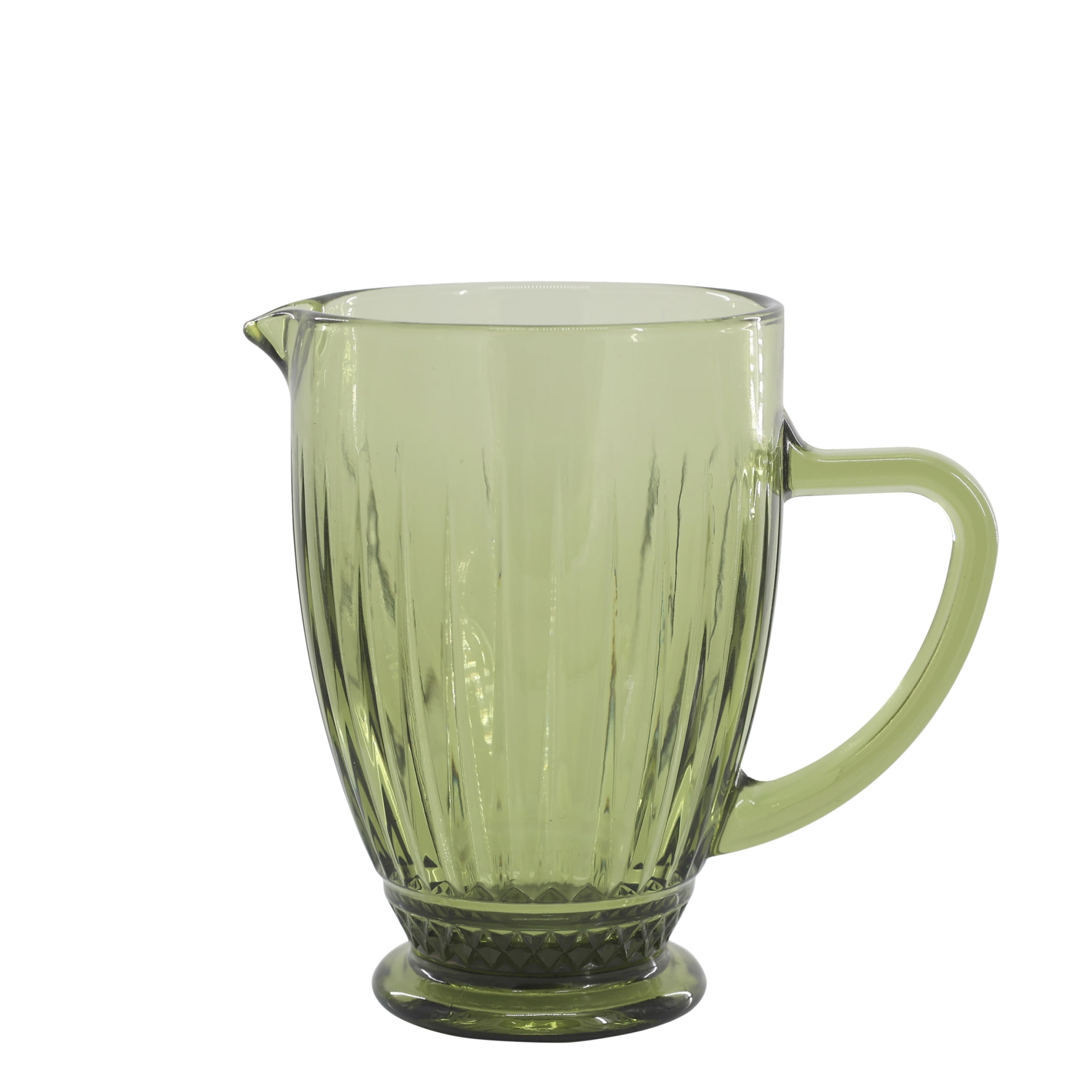 Vyrobený je z průhledného skla v zelené barvě, má praktické velké ucho a jeho povrch zdobí plastický vroubkovaný dekor.