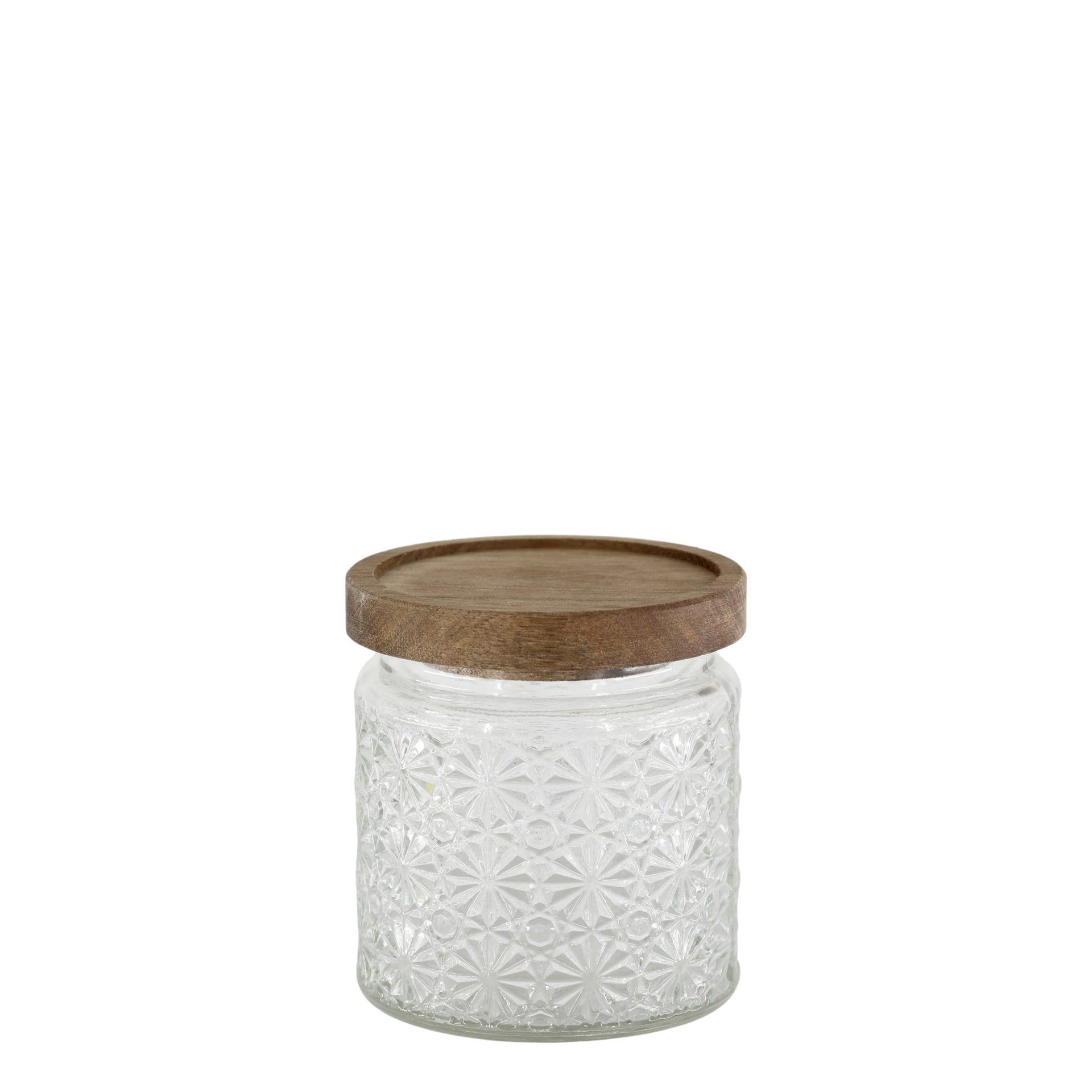 Čiré sklo zdobí plastický květinový vzor. Spojení skla s přírodním materiálem je nestárnoucí klasikou, která doladí kuchyňskou linku nebo poličku. objem 450 ml / průměr 10 cm / výška 11 cm Vyrobeno ze skla, akáciového dřeva a silikonu.