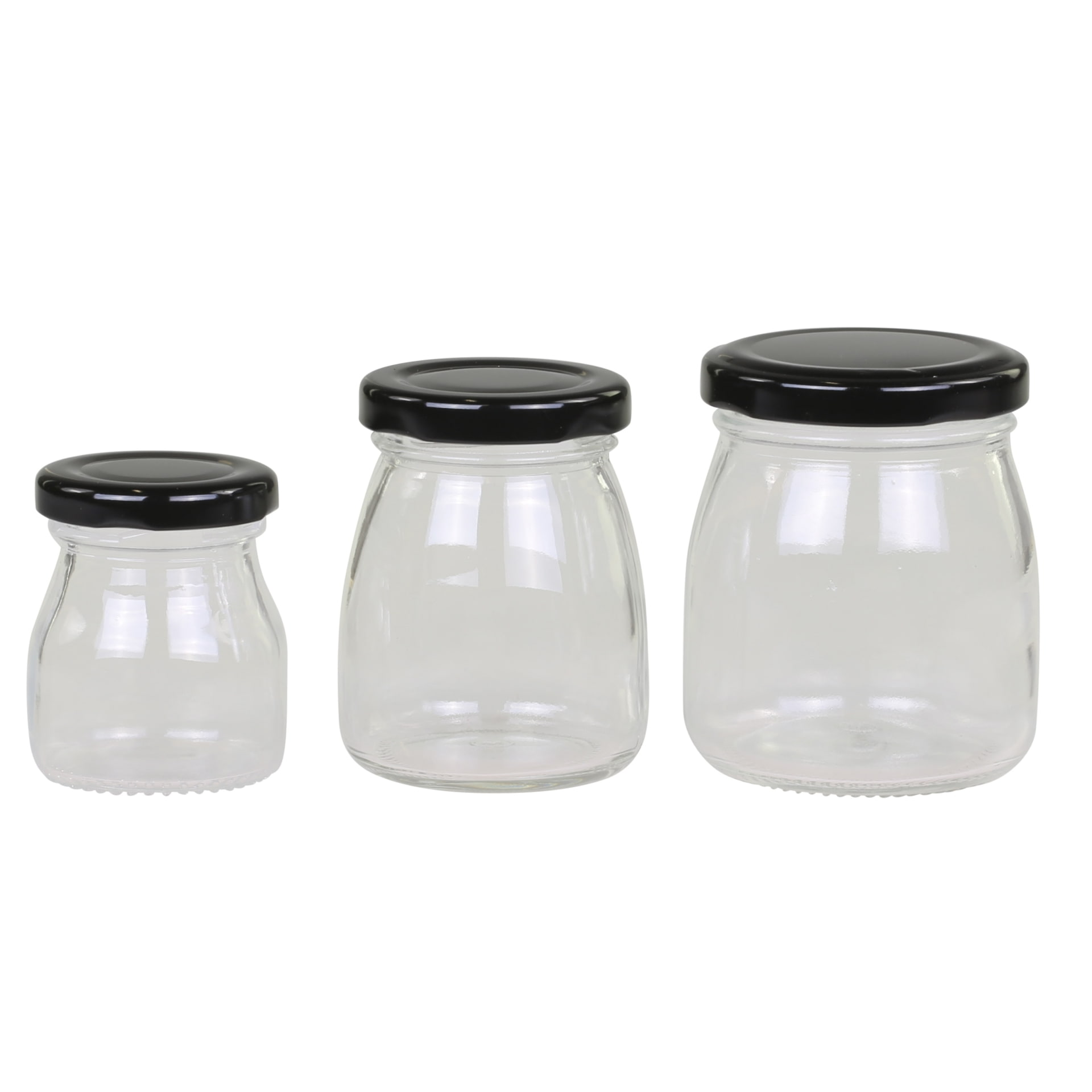 Velikost L: objem 150 ml / průměr 6 cm / výška 7,5 cm Vyrobeno ze skla a PVC víčka.