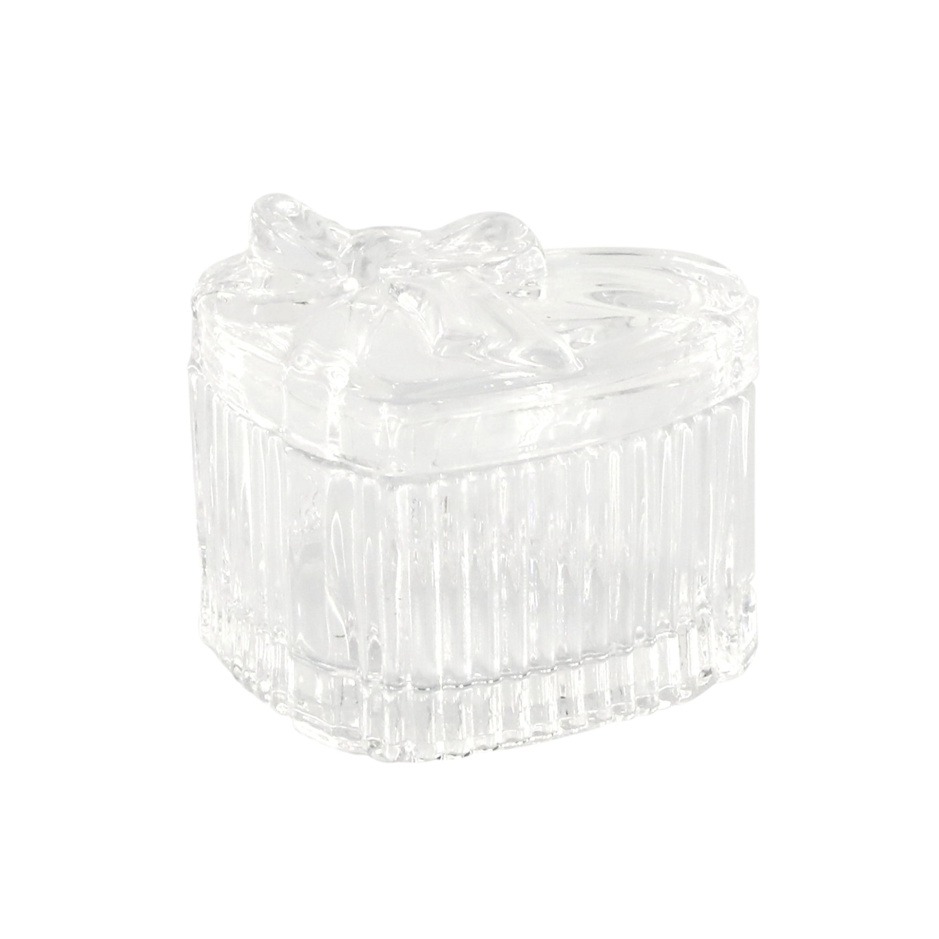 Vyrobena je z čirého skla s plastickým zdobením v podobě jemných vroubků po okraji a vystouplé mašle na víku.
