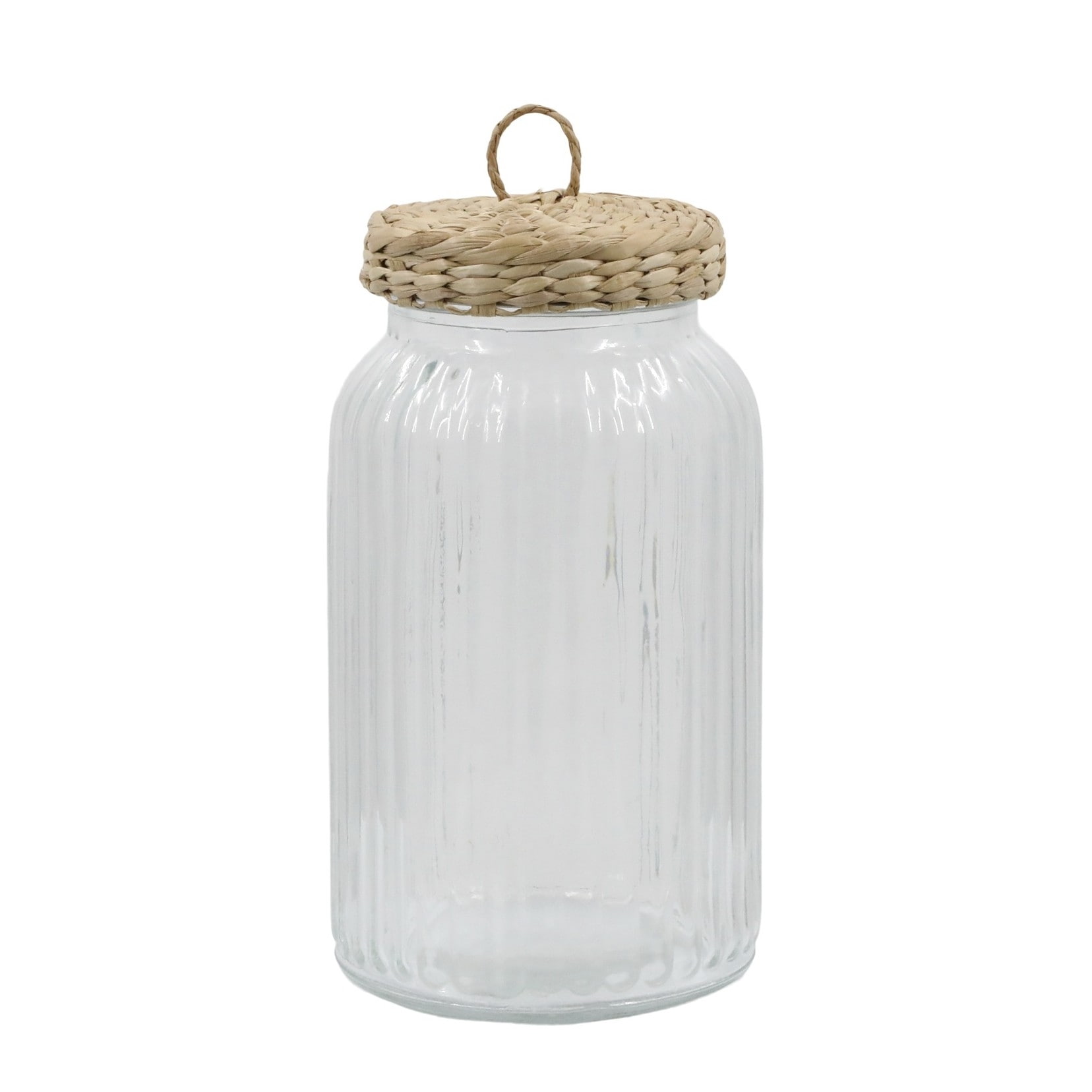 Čiré sklo s jemnými svislými vroubky krásné doplňuje víko opletené sušeným rákosem. Spojení skla s přírodním materiálem je nestárnoucí klasikou, která doladí kuchyňskou linku nebo poličku. objem 1,2 l / průměr 11 cm / výška 20 cm Vyrobeno ze skla, kovu a rákosu.