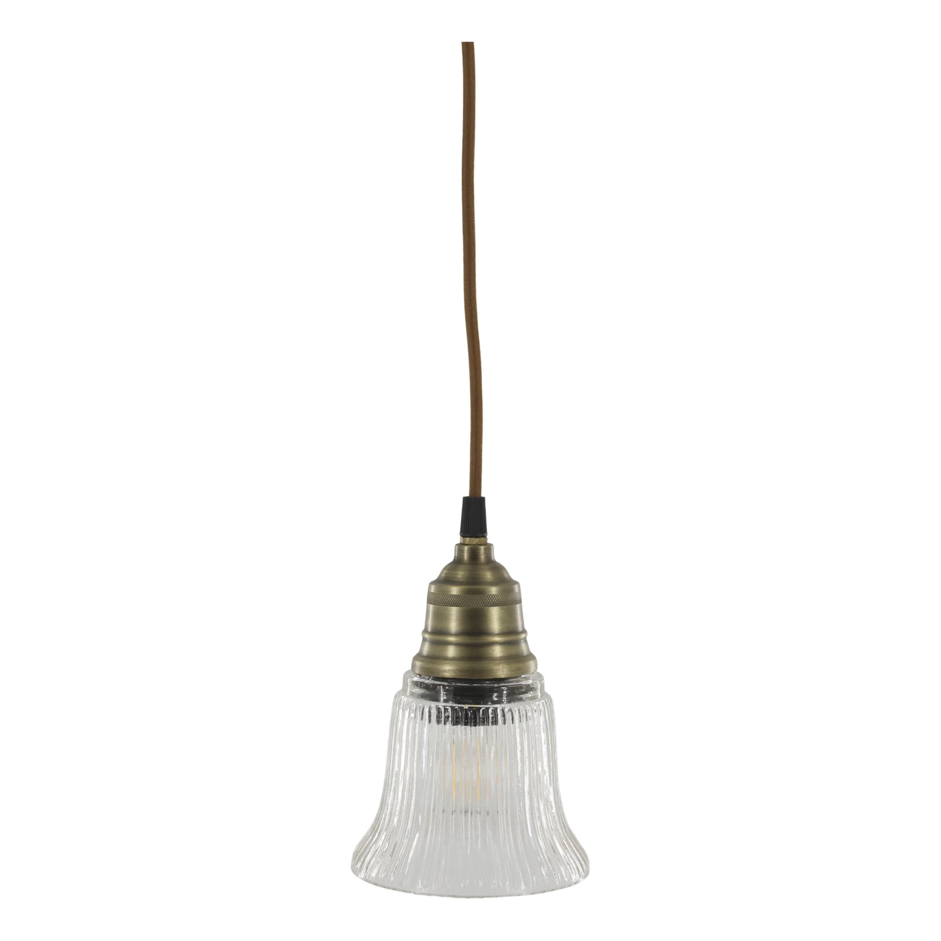Stropní lampa na první pohled zaujme stínidlem z průhledného skla, zdobeného jemnými vroubky, které vytváří jemné a atmosférické světlo. Mosazně zbarvené kovové prvky dodávají lampě eleganci a nadčasový nádech.
