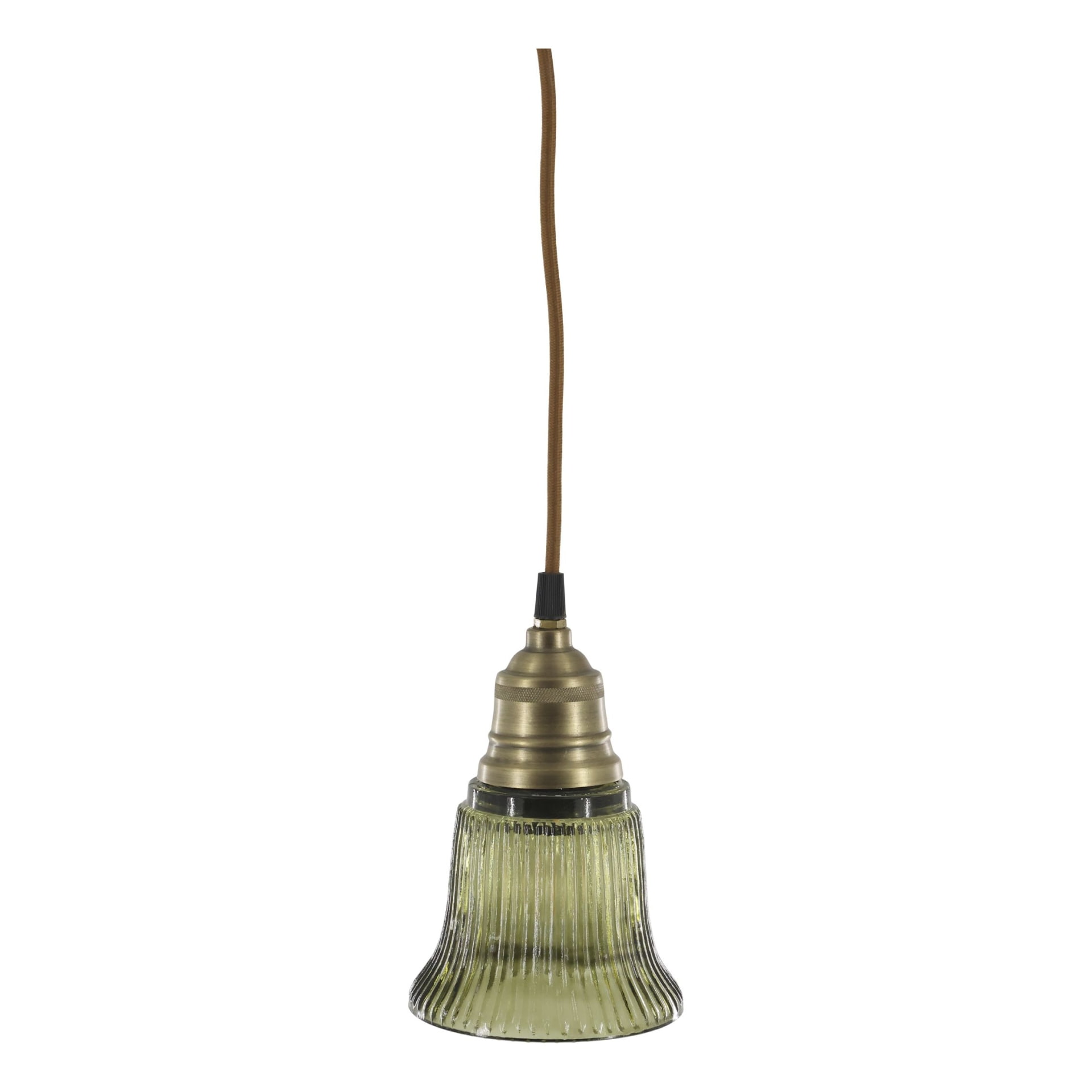 Stropní lampa na první pohled zaujme stínidlem z průhledného zeleného skla, zdobeného jemnými vroubky, které vytváří jemné a atmosférické světlo. Mosazně zbarvené kovové prvky dodávají lampě eleganci a nadčasový nádech.