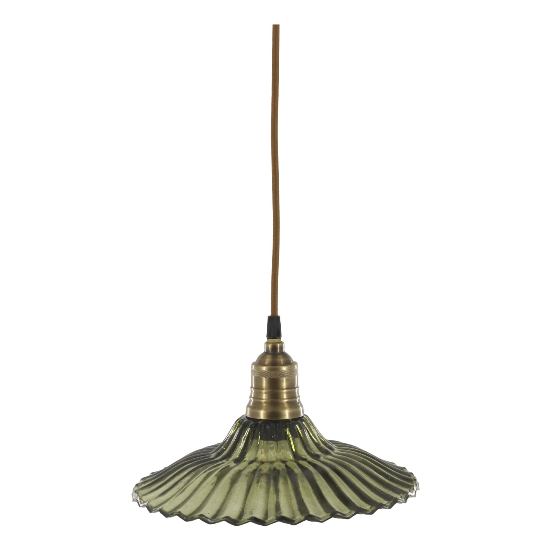 Stropní lampa na první pohled zaujme stínidlem z průhledného zeleného skla s efektním zvlněním, které vytváří jemné a atmosférické světlo. Mosazně zbarvené kovové prvky dodávají lampě eleganci a nadčasový nádech.