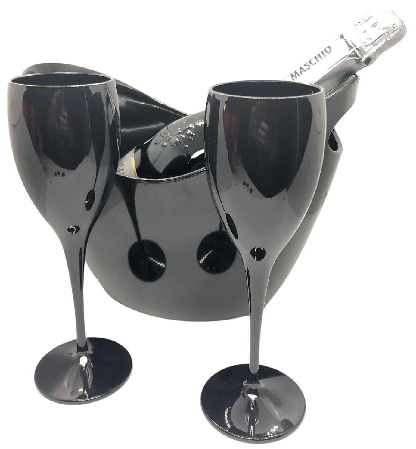 Chladící nádoba na víno černá 4L a 2 ks sklenice na víno černé 150 ml Elegantní chladící nádoba na víno a led, z pevného plastu s vysokým leskem pomáhá k podávání nápojů ve správné teplotě. Nádobu naplníte ledem, vložite prosecco nebo sekt popř. víno a párty může začít. Chladící láhev můžete doplnit o stylové plastové sklenice. Jsou opakovaně použitelné z nerozbitného materiálu a tedy vhodné i na bazénovou párty. Samozřejmostí je možnost mytí plastových sklenic v myčce. Ještě nafouknout pár balónků heliem, rozhodit pár serpentýn a párty může začít. Sada obsahuje: 1 x ks chladící nádoba na víno černá a 2 x ks plastová sklenice na víno černá 150 ml. Rozměr: délka 27 cm x šířka 19,5 cm x 19 cm výška
