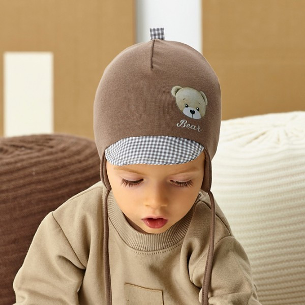 Bavlněná chlapecká čepice - dvouvrstvá - s kšiltem, zavazuje se u krku - barevný potisk na přední straně - dostupné barvy: moka Složení: 95% bavlna, 5% elastan