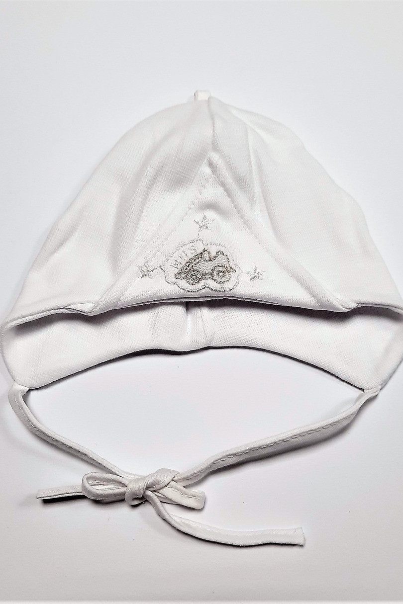 Bílá chlapecká čepice s malou výšivkou auta. Složení: 100% bavlna