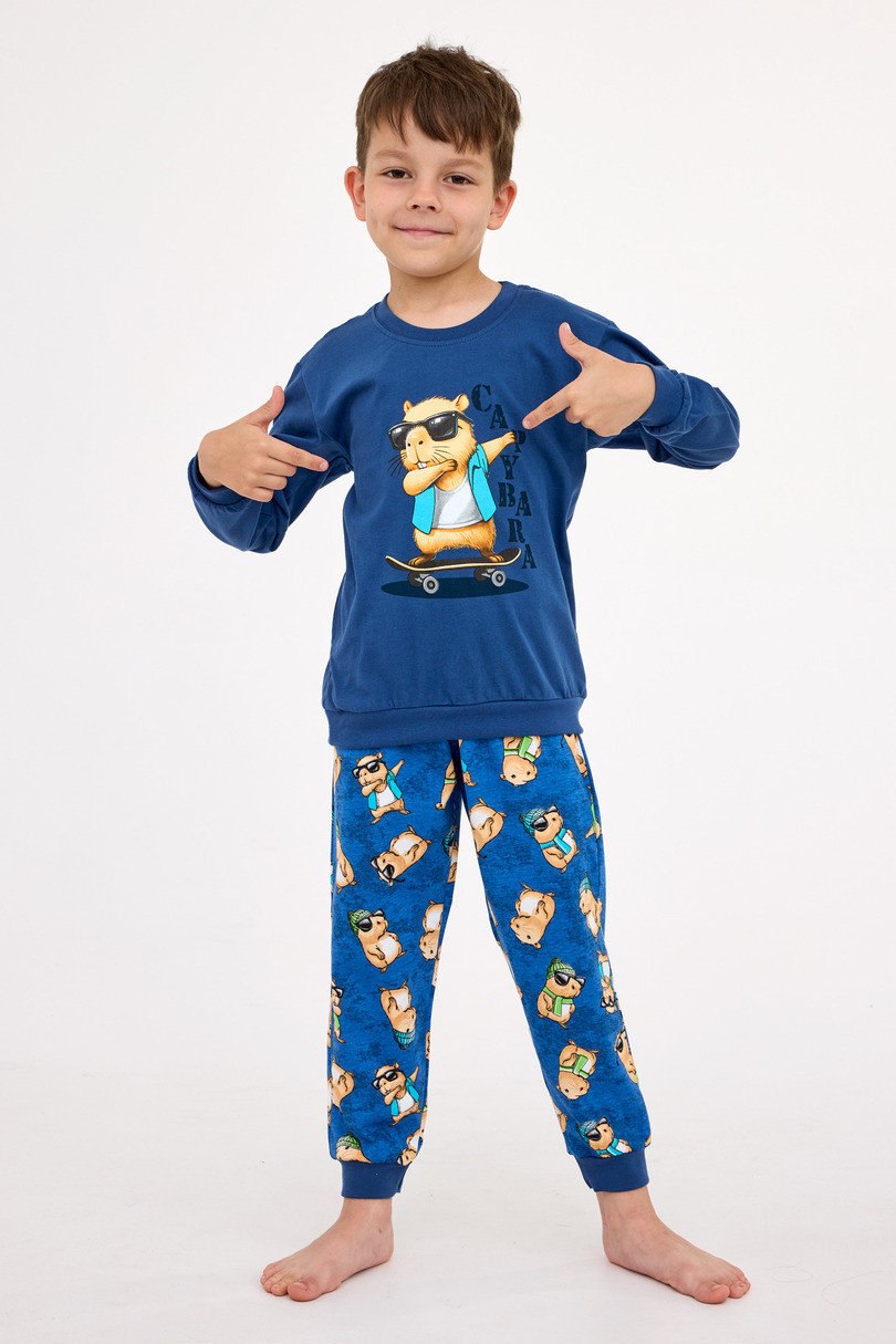 Chlapecké pyžamo DR 593/177 CAPYBARA v sobě spojuje pohodlí, kvalitu a okouzlující design. Je vyrobeno ze 100% měkké a prodyšné bavlny, takže zaručuje pohodlí a volnost pohybu během spánku. Vrchní díl s dlouhými rukávy zdobí barevný potisk kapybary, který mu dodává jedinečný dětský charakter. Dlouhé vzorované kalhoty ve stejné barvě mají v pase gumu a manžety, spodní část a nohavice jsou zakončeny praktickými šňůrkami, které zabraňují shrnování látky. Pyžamo je zabaleno v atraktivní krabičce, takže je ideálním dárkem..