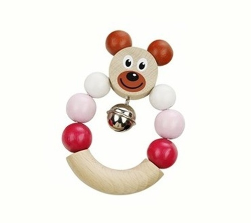 Chrastítko s medvídkem v růžové barvě. Rolnička jemně cinká. Chrastítko má nízkou hmotnost a je vnodné pro děti od 6ti měsíců. Výrobek splňuje požadavky EU na bezpečnost hraček.