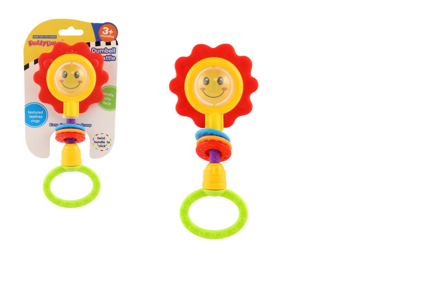 Chrastitko obsahuje uprostřed květiny krásného lvíčka nebo usměvavou tvář. Také kroužky a otáčecí rukojeť, která při pohybu vydává zvuky cvakání. Rozměr chrastítka: 8 x 19 cm Vhodné pro děti od 3 měsíců