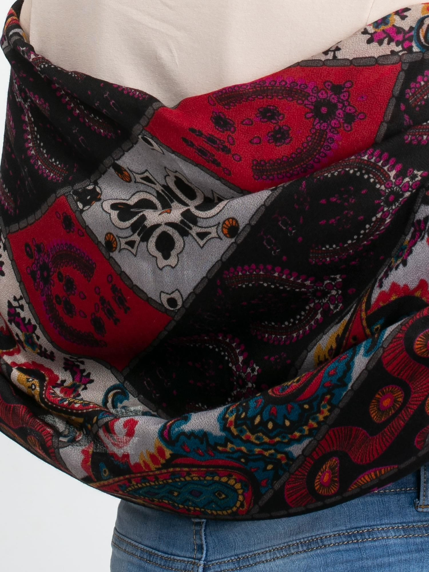 Šál s lidovým vzorem v černé barvě. složení látky: 100% viskóza způsob mytí: ruční mytí Rozměry: přibližně. 180 x 100 cm