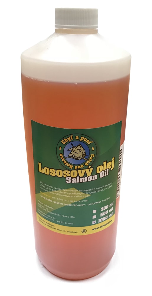 Olej z lososa je významným zdrojem nenasycených mastných kyselin (EPA a DHA). Doporučujeme použít nejen při výrobě boilies, ale i jako dip. Podstatně zvýší atraktivnost Vaší návnady a nástrahy. Tento olej je v prémiové kvalitě a je tak vhodný i pro Vaše čtyřnohé parťáky. Olej z lososa je významným zdrojem nenasycených mastných kyselin (EPA a DHA). Doporučujeme použít nejen při výrobě boilies, ale i jako dip. Tento olej je v prémiové kvalitě a je tak vhodný i pro Vaše čtyřnohé parťáky. Losos OilOlej z lososa je významným zdrojem nenasycených mastných kyselin (EPA a DHA). Doporučujeme použít nejen při výrobě boilies, ale i jako dip. Podstatně zvýší atraktivnost Vaší návnady.Dávkování 40 - 60ml na 1 kg suché směsi.
